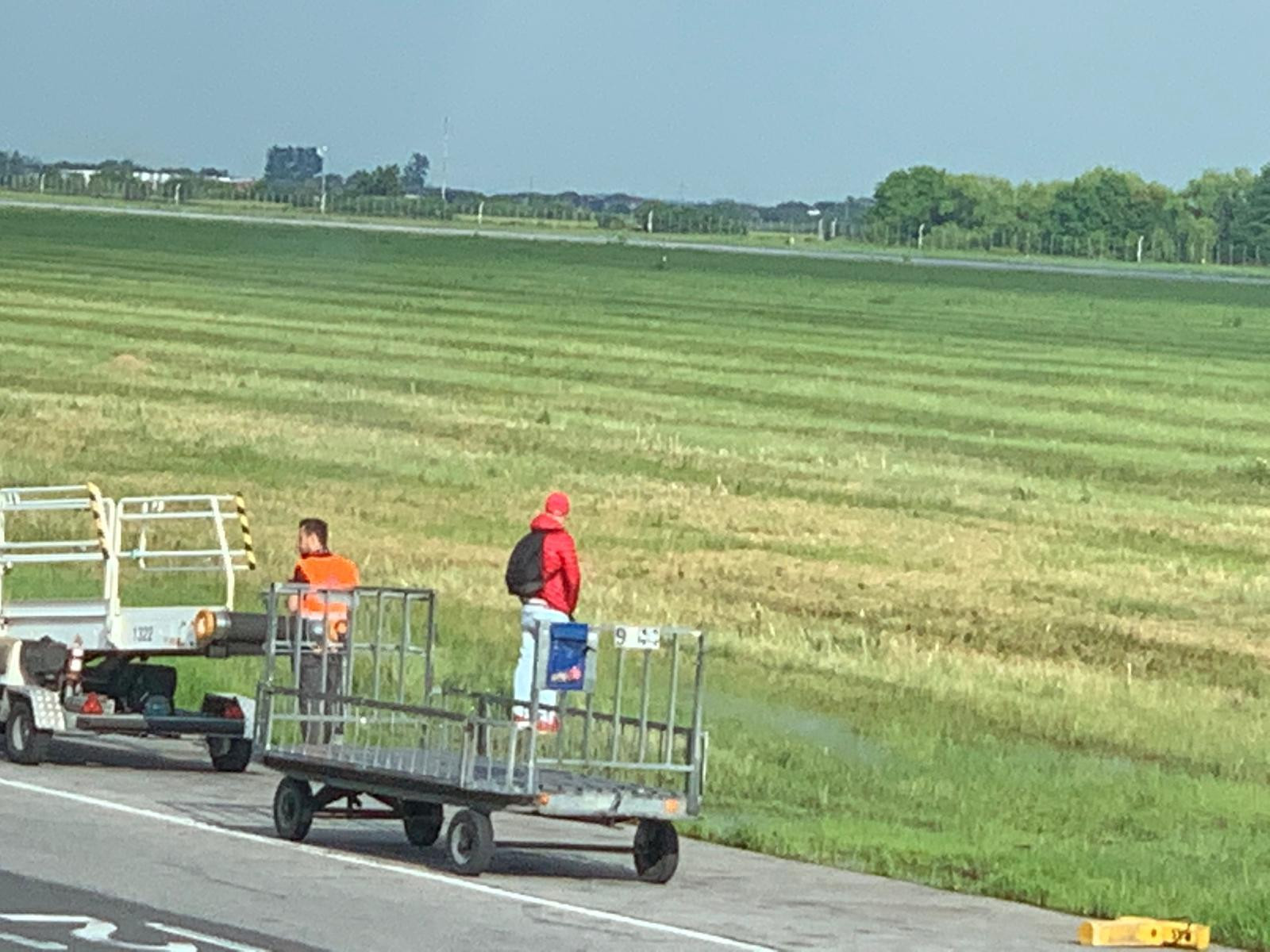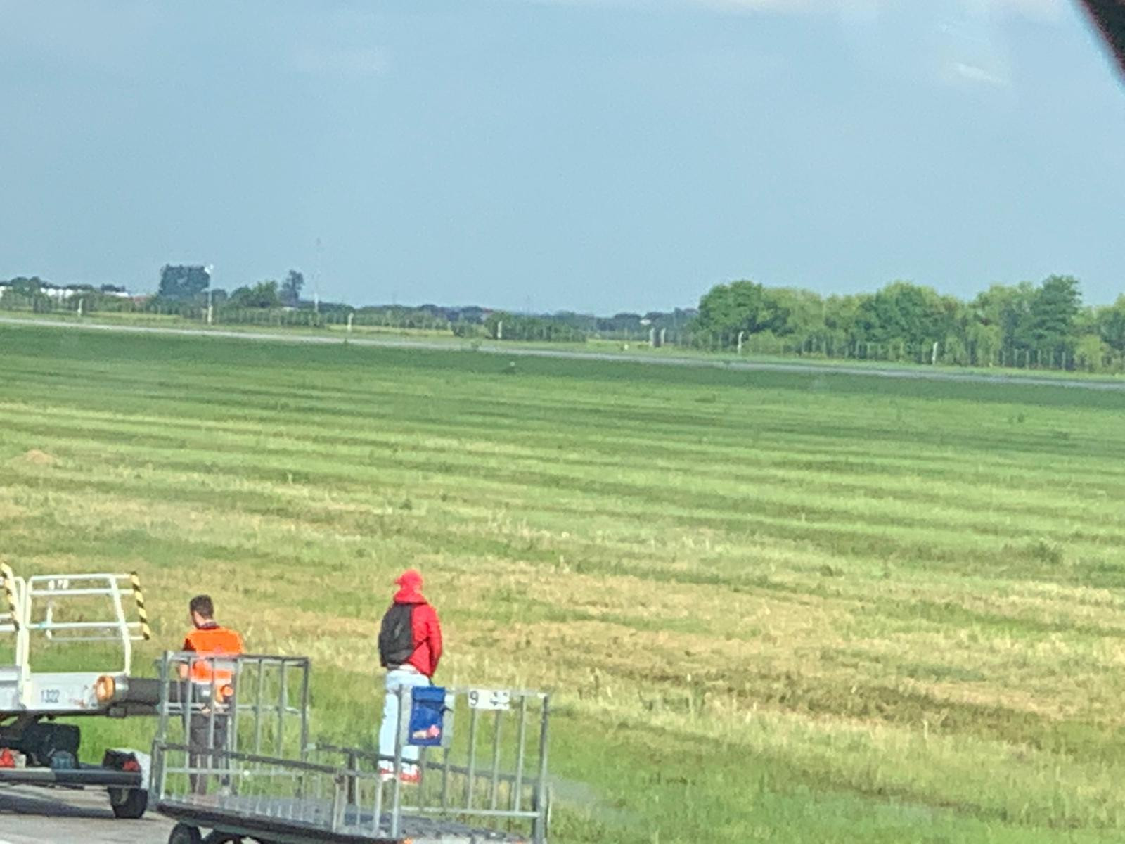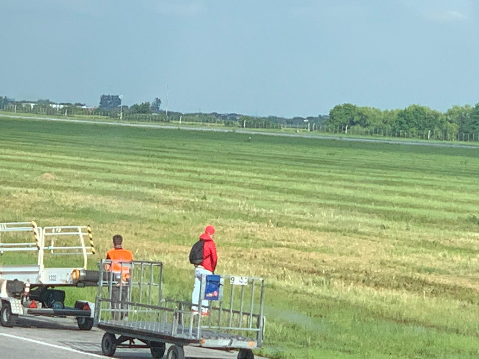 Un pasager al unei curse aeriene a fost fotografiat sâmbătă după-amiază în vreme ce se îndepărtează de ceilalţi călători şi se duce în iarba de la marginea pistei, unde urinează.