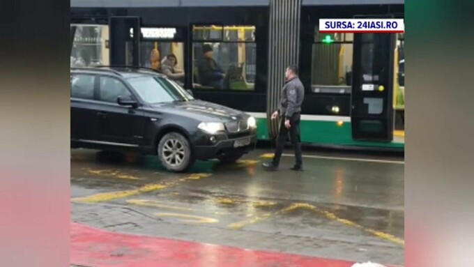 Incidentul a fost surprins miercuri în traficul din Iași, în zona Copou, și a fost filmat de martori. Imaginile au ajuns apoi pe rețelele sociale. Se vede cum un vatman coboară din tramvaiul aflat într-o stație fără refugiu și merge la mașina care nu a oprit regulamentar.