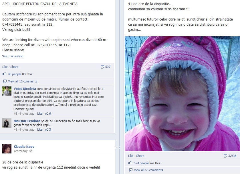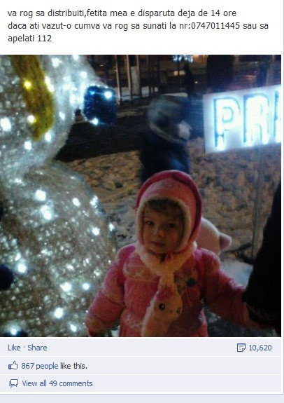 Politistii sustin ca acesti doi copii provin din doua relatii. Mama fetitei de trei ani, Klaudia Nagy, a postat pe Facebook o fotografie cu aceasta si un mesaj prin care ii roaga pe cei care ar vedea-o sa sune la 112.
