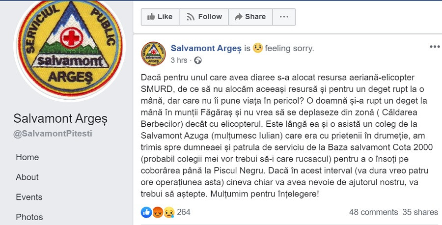 "Dacă pentru unul care avea diaree s-a alocat resursa aeriană-elicopter SMURD, de ce să nu alocăm aceeași resursă și pentru un deget rupt la o mână, dar care nu îi pune viața în pericol? O doamnă și-a rupt un deget la mână în munții Făgăraș și nu vrea să se deplaseze din zonă ( Căldarea Berbecilor) decât cu elicopterul. Este lângă ea și o asistă un coleg de la Salvamont Azuga (mulțumesc Iulian) care era cu prietenii în drumeție, am trimis spre dumneaei și patrula de serviciu de la Baza salvamont Cota 2000 (probabil colegii mei vor trebui să-i care rucsacul) pentru a o însoți pe coborârea până la Piscul Negru. Dacă în acest interval (va dura vreo patru ore operațiunea asta) cineva chiar va avea nevoie de ajutorul nostru, va trebui să aștepte. Mulțumim pentru înțelegere!", este mesajul postat pe Facebook.
