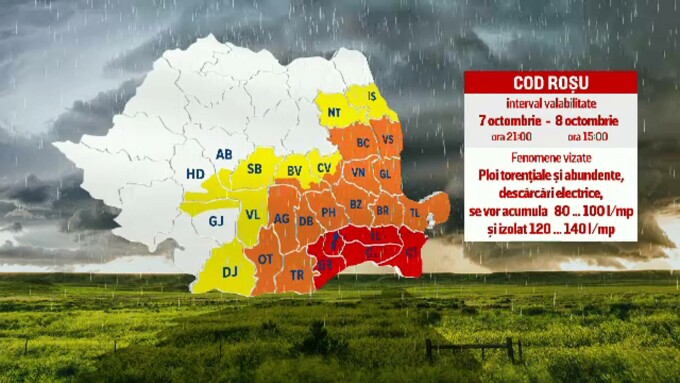 Capitala și județele Ilfov, Constanța, Giurgiu, Călărași și Ialomița rămân sub cod roșu de ploi torențiale până la ora 15:00.