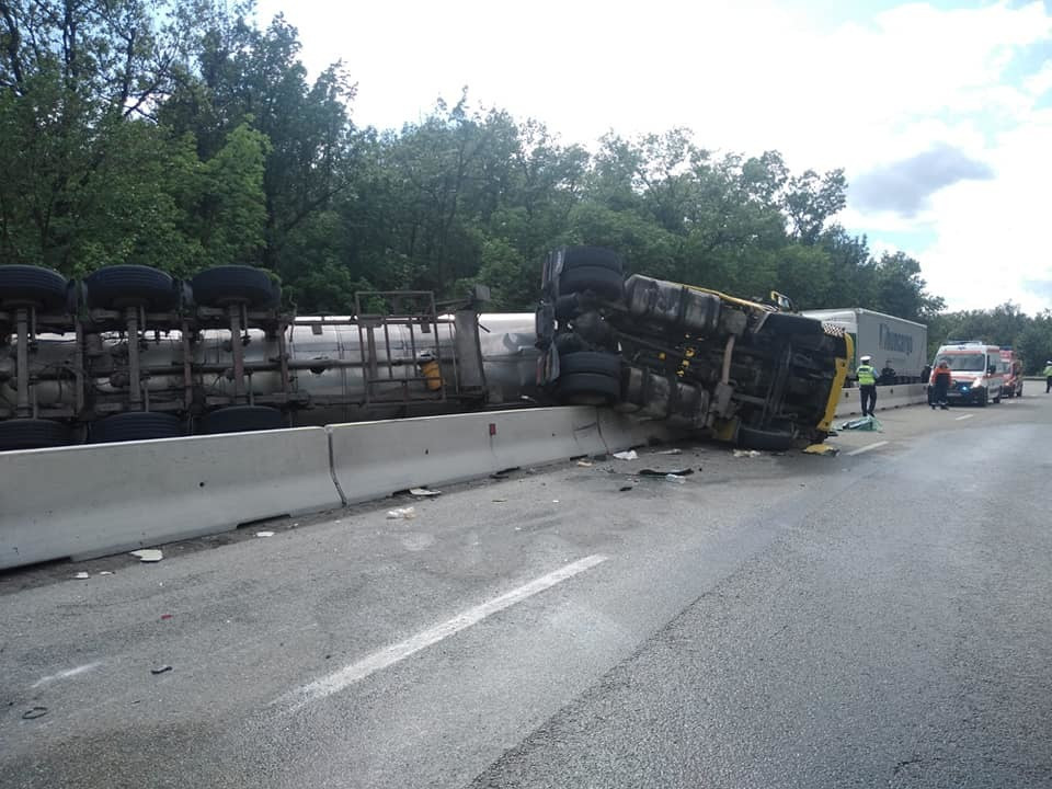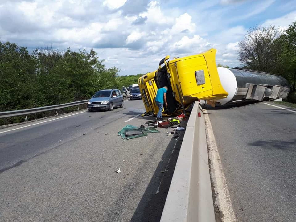 Echipajele prezente la faţa locului asigură măsurile de prevenire a situaţiilor de urgenţă până la ridicarea în siguranţă a autocisternei. Autocisterna era condusă de un cetăţean grec, de 65 de ani, care nu a fost rănit