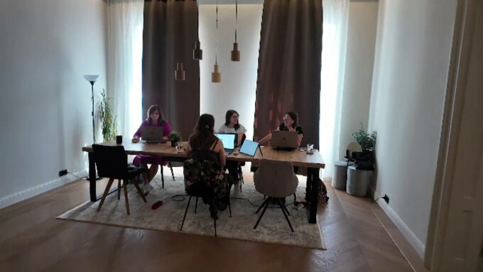 Două tinere lucrează în regim hibrid la o firmă de marketing. Compania a decis să închirieze pentru ele birouri flexibile în centrul Brașovului. Aici au la dispoziție pupitre dotate cu monitor, spații de odihnă și relaxare, și un oficiu, unde pot lua masa.