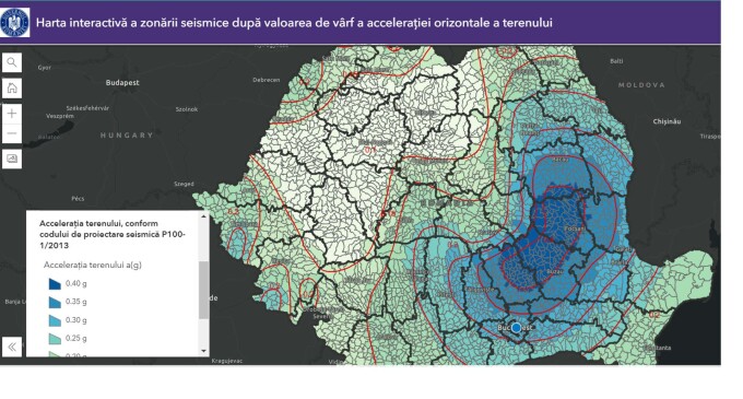 Hartă interactivă care prezintă valorile de vârf a accelerației terenului pentru proiectare la cutremur a(g) la nivelul României poate fi consultată aici.