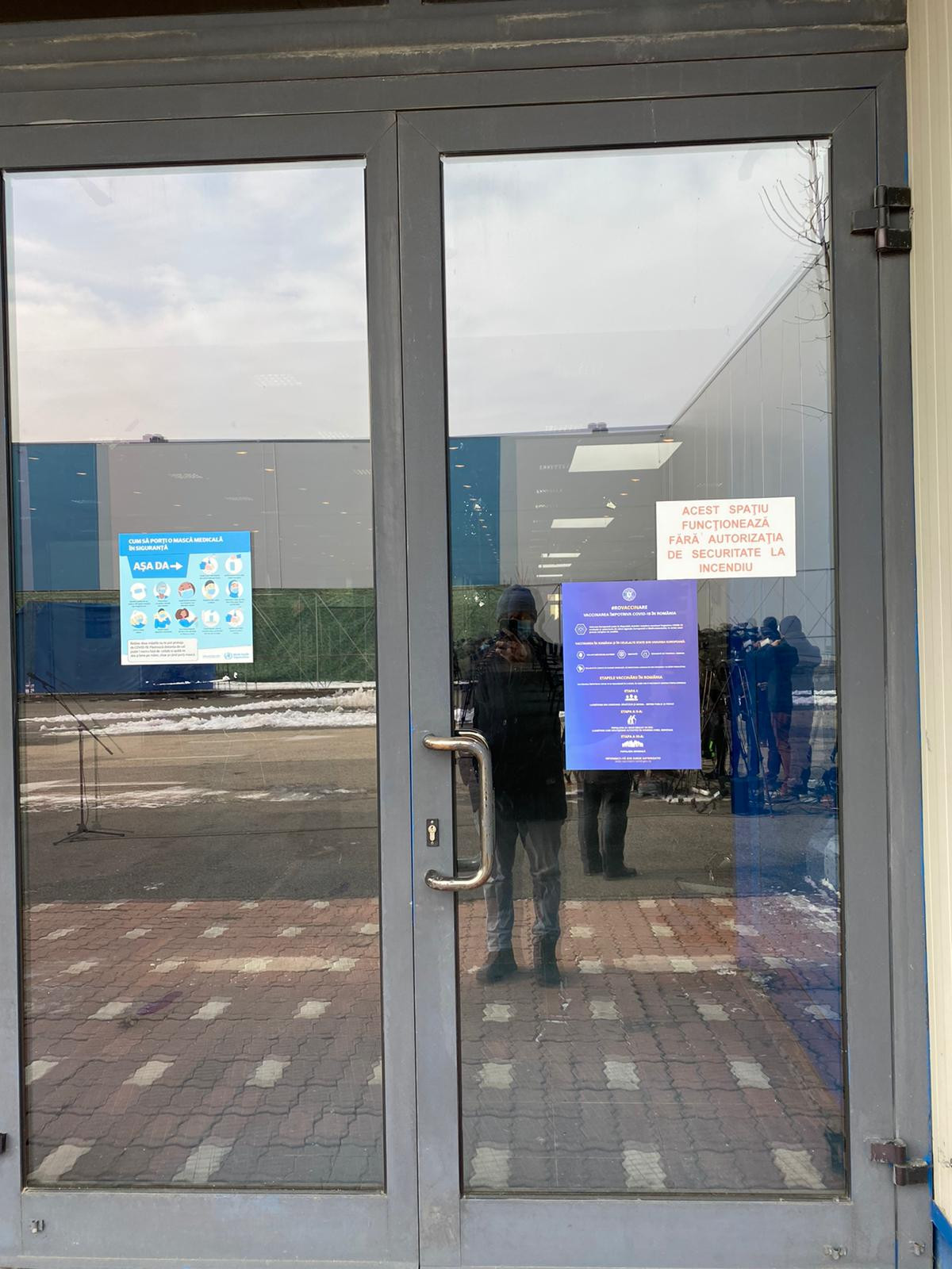 Centrele de imunizare de la Romexpo sunt amplasate într-un spațiu pentru care ISU nu a eliberat autorizație de securitate la incendiu, după cum se afișează pe ușă.