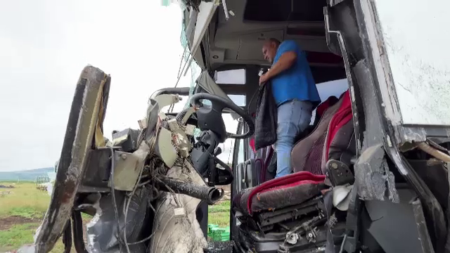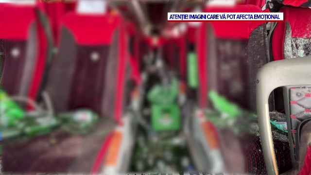 Partea din față a autocarului a fost distrusă în totalitate, iar șoferul de 33 de ani a fost prins între bucățile de caroserie și parbriz. Două femei, de 19 și 38 de ani, sunt și ele grav rănite. Alți pasageri s-au ales cu o sperietură groaznică și vânătăi, după ce s-au lovit de scaune ori de navetele cu sticle ajunse pe culoarul autocarului.