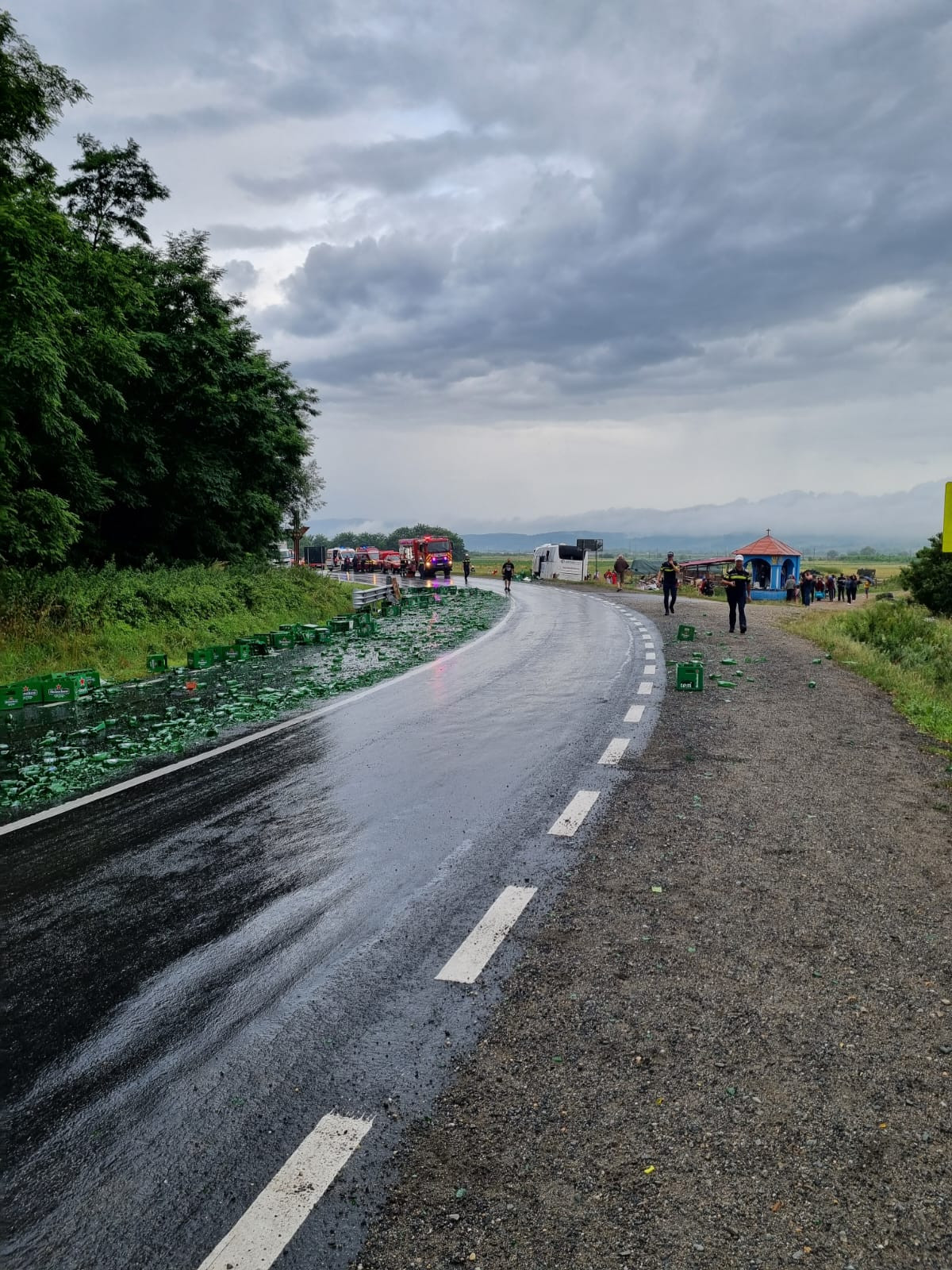 Accidentul a avut loc la Porumbacu de Jos, în județul Sibiu, unde un TIR încărcat cu ambalaje de sticlă a derapat într-o curbă. Remorca sa a lovit autocarul.