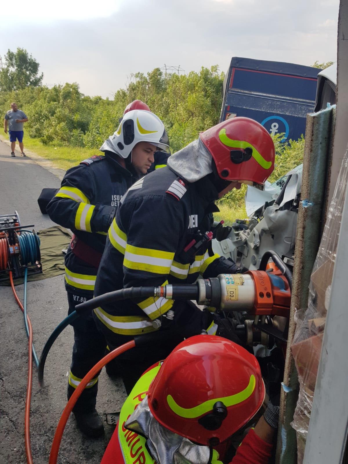 Șoferul care a murit se afla în maşină împreună cu soţia, care a fost grav rănită şi transportată cu elicopterul la Spitalul Universitar. Cei doi erau din Caraş Severin, iar mașina lor transporta mezeluri.