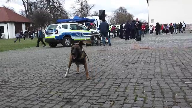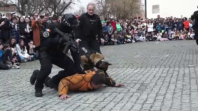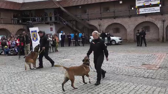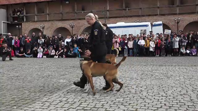 Doi câini polițiști din rasa ciobănesc belgian au făcut spectacol în Cetatea Medievală din Târgu Mureș.