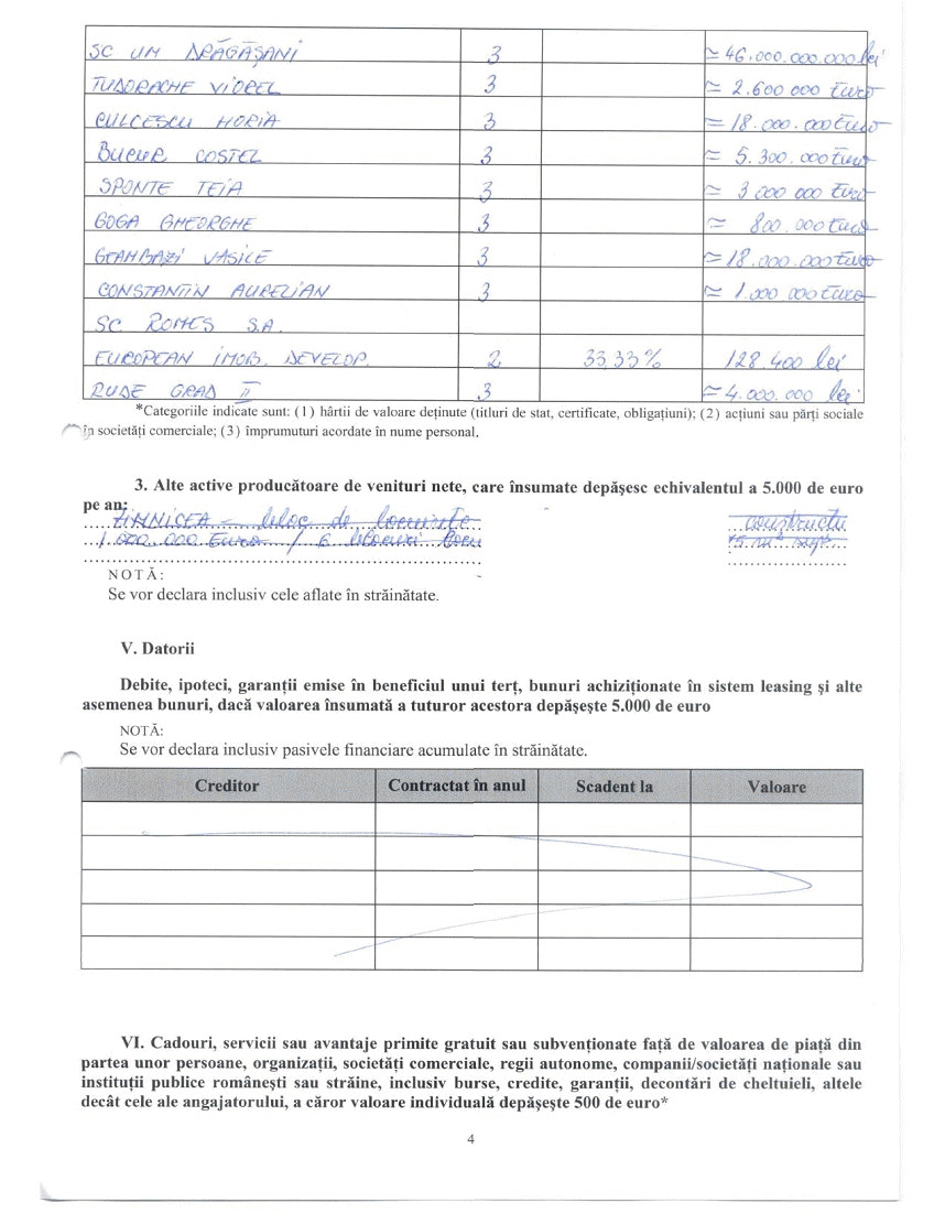 In ceea ce priveste imprumuturile acordate, deputatul PNL sustine, spre deosebire de luna octombrie, ca a imprumutat SC UM Dragasani cu 46 miliarde de lei, echivalentul a 10 miliarde de euro.
