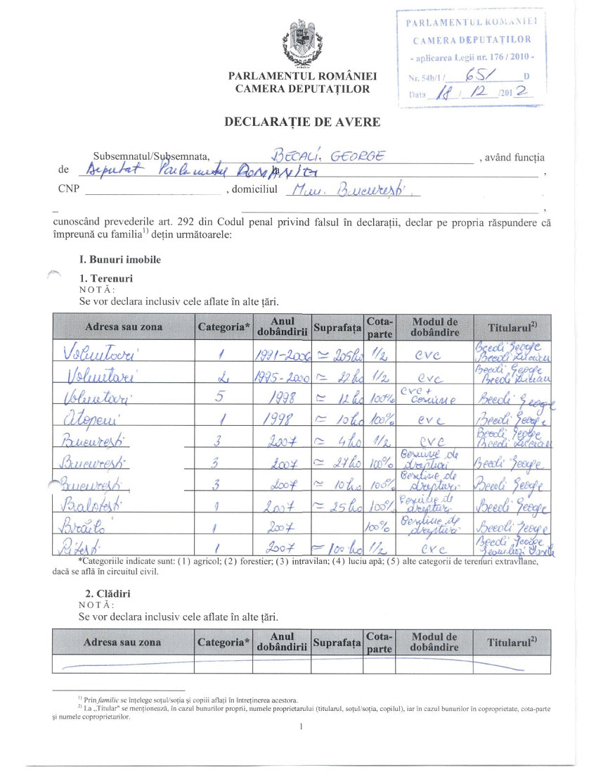 George Becali sustine in declaratia de avere semnata in 18 decembrie 2012 ca a obtinut in plus fata de momentul in care isi depunea candidatura pentru postul de deputat circa 17 hectare de teren intravilan in Bucuresti, majorand astfel suprafata unui teren in posesia caruia a intrat in anul 2007, prin "concesiune de drepturi". Astfel, deputatul PNL ajunge sa detina in Capitala terenuri intravilane de aproximativ 41 de hectare.