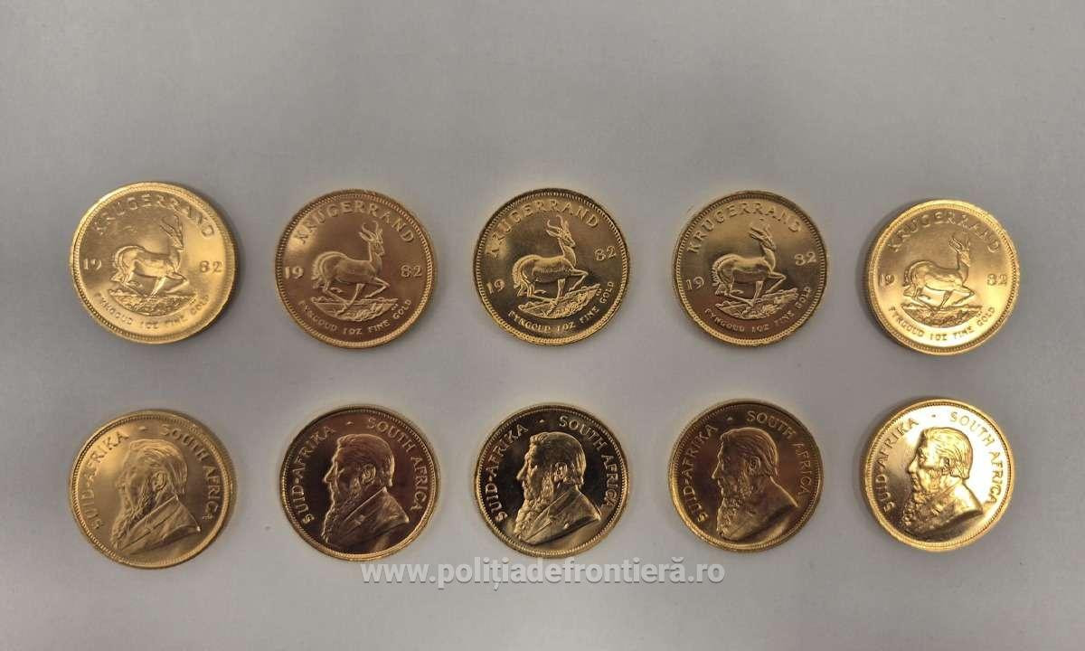 În data de 6 aprilie 2025, s-a prezentat pe sensul de ieşire din ţară, pentru a călători în direcţia Londra - Marea Britanie, o femeie, cetăţean român. Acţionând în baza unei analize de risc, a fost făcut un control amănunţit în bagajele de mână ale persoanei respective, fiind astfel descoperite zece monede, confecţionate din metal de culoare galbenă, inscripţionate Suid Afrika- South Africa.