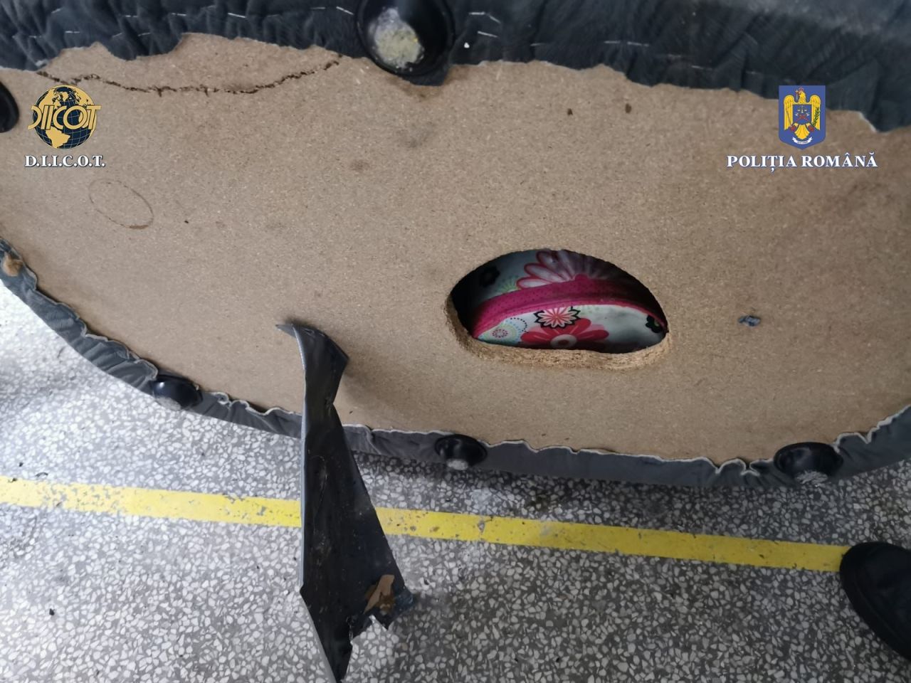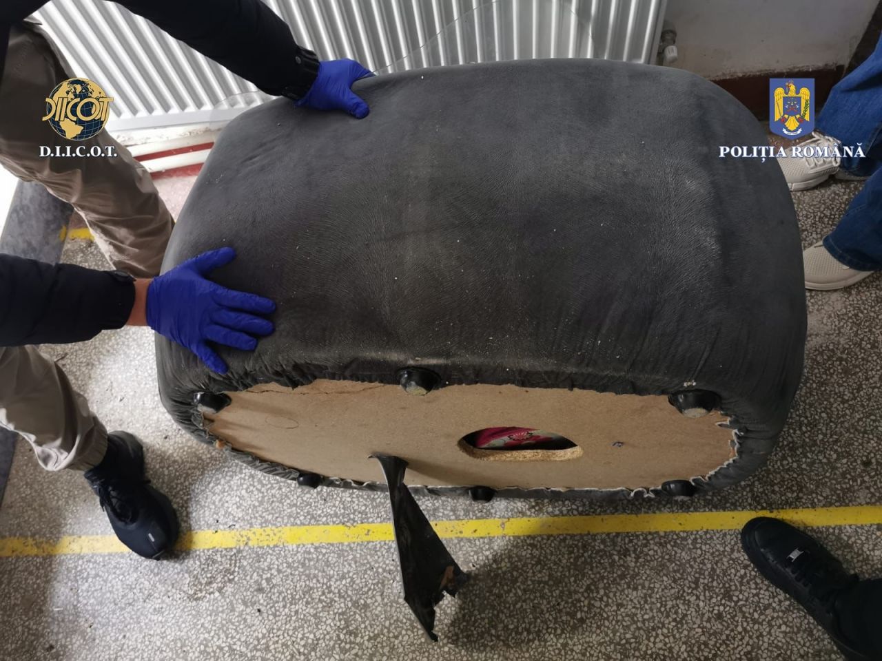 Au fost puse în aplicare 7 mandate de percheziţie domiciliară, în judeţul Cluj, fiind descoperite şi ridicate peste 400 de grame de canabis (muguri), ascunse în interiorul unui corp de canapea, 2 pungi cu substanţă cristalină (3-CMC), comprimate de Diazepam, 4 telefoane mobile, un cântar de mare precizie, 3 dispozitive de stocarea datelor, 8.000 de lei şi mai multe ustensile folosite pentru consumul de droguri, toate cu urme de substanţă.