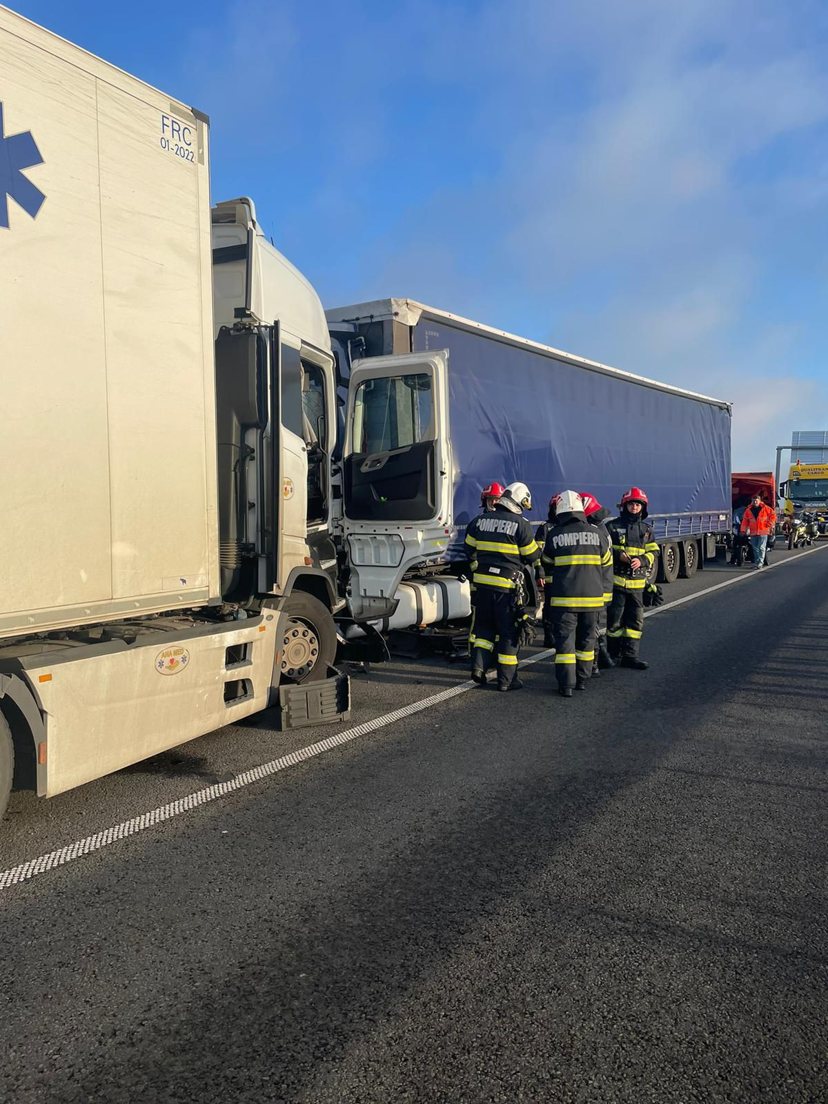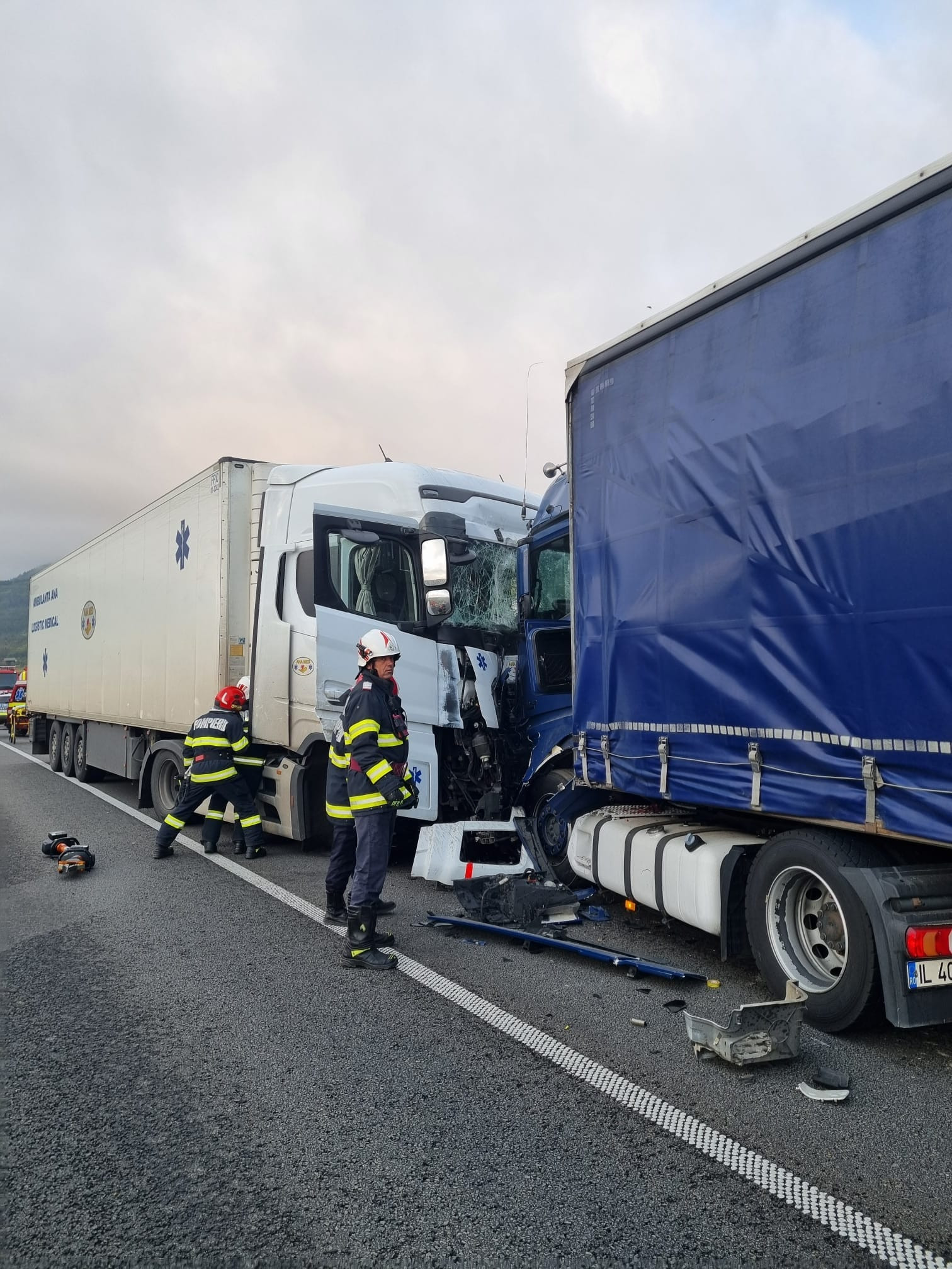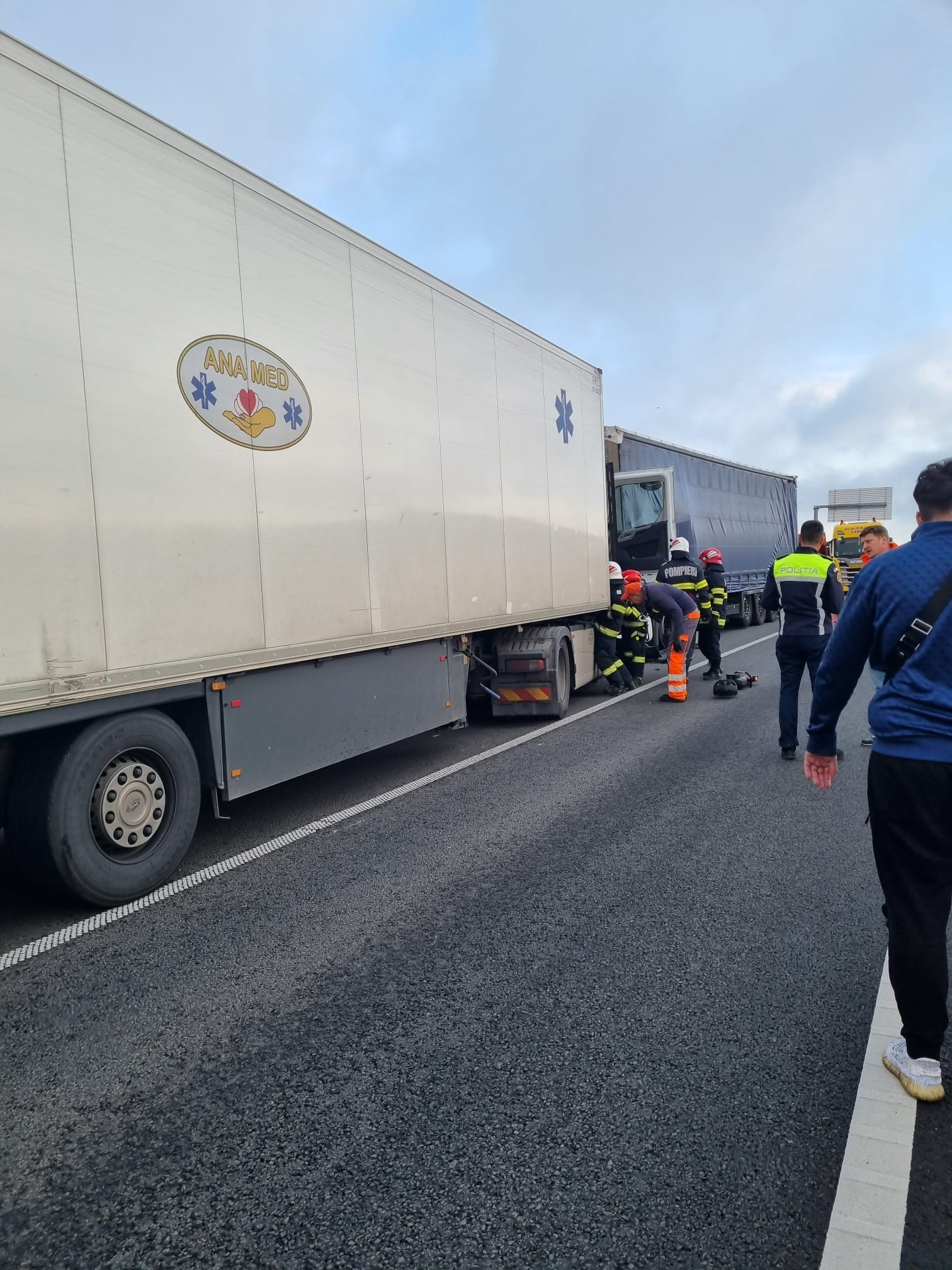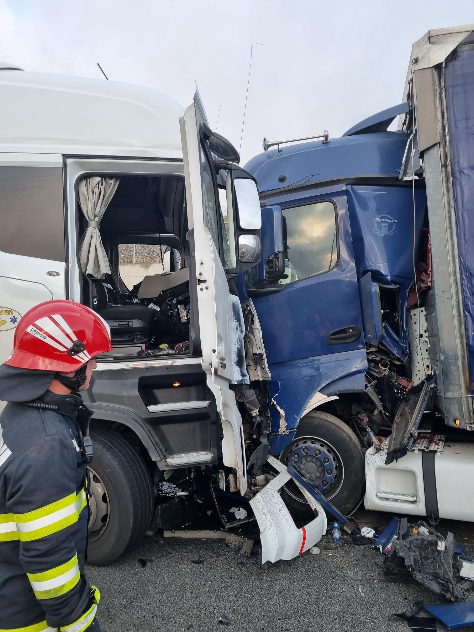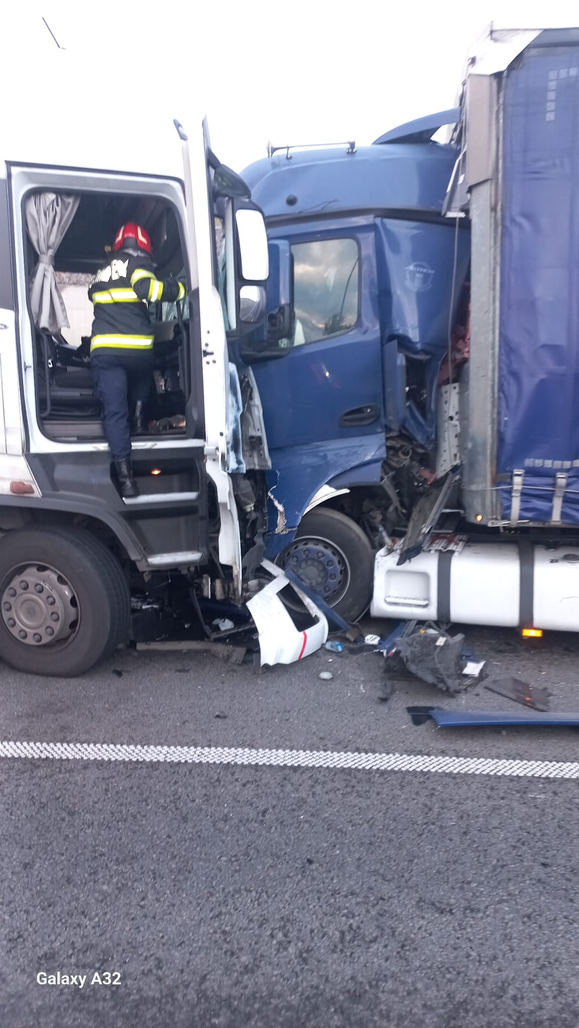 Două TIR-uri s-au ciocnit frontal între A1 și DN 7. Trei persoane au fost transportate la spital. GALERIE FOTO
