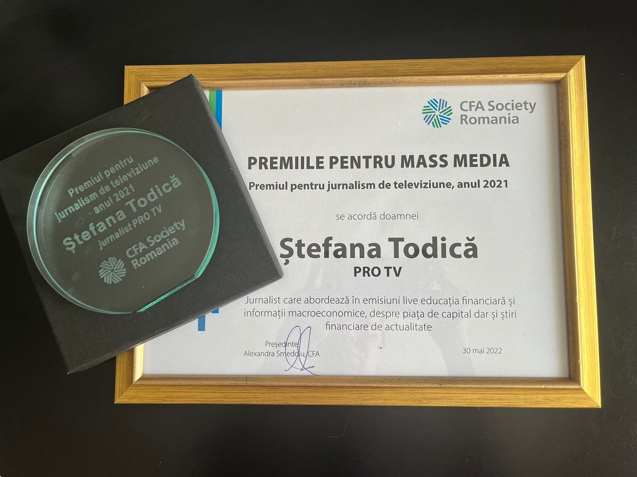Emisiunea iBani, prezentată de Ștefana Todică, și reportajele economice pe care le realizează pentru Știrile Pro TV, au primit ”premiul pentru jurnalism de televiziune” din partea CFA România.
