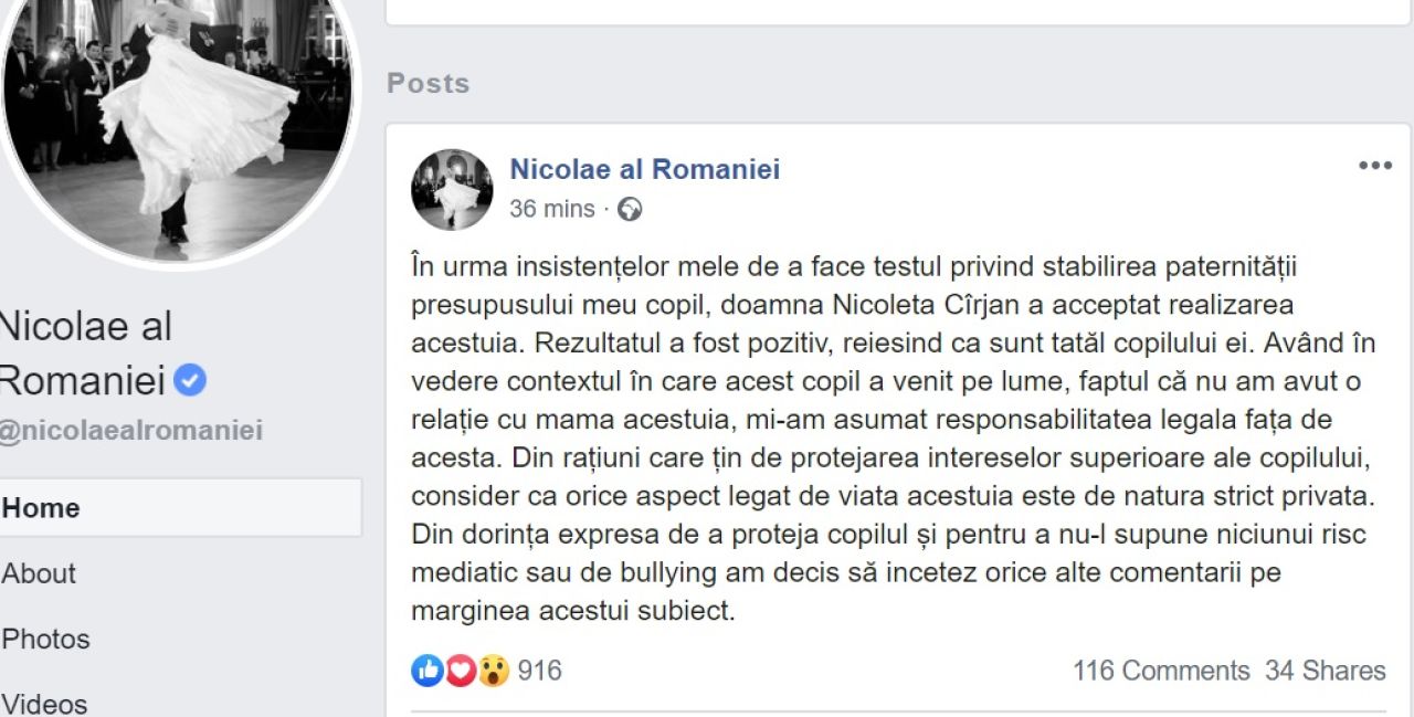 Fostul principe Nicolae al României a recunoscut, într-un mesaj postat pe Facebook, că este tatăl copilului Nicoletei Cîrjan.