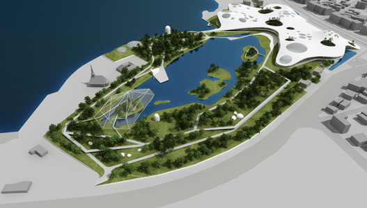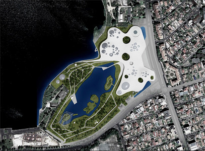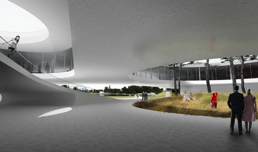 Interesant este ca designerii au gandit acoperisul ca o mare piata legata prin alei de piete mai mici. Legatura intre parcul si esplanada lacului Tabacarie cu Bulevardul Mamaia, terasa cladirii devine o piata urbana spectaculoasa, deschisa catre oras.