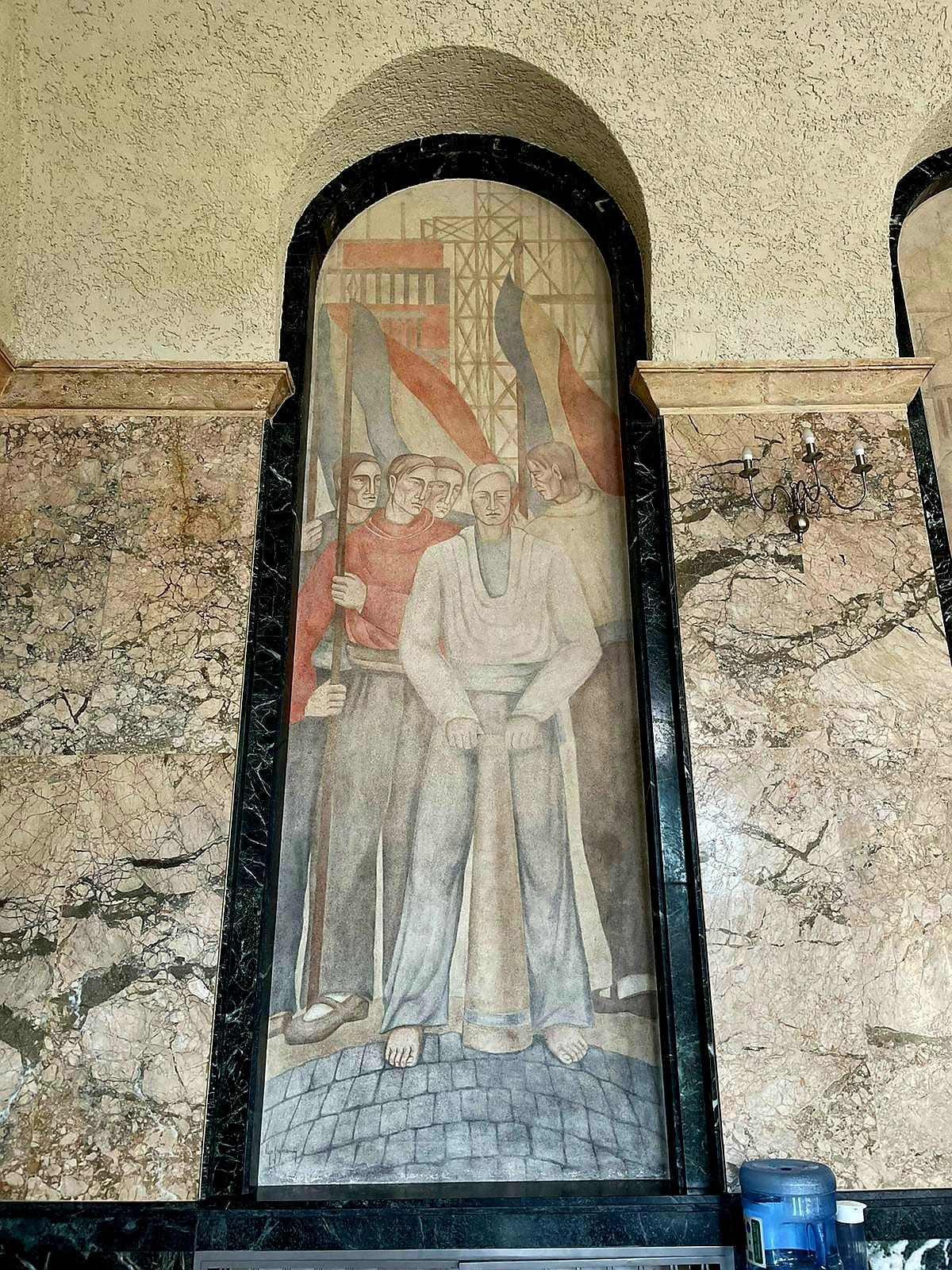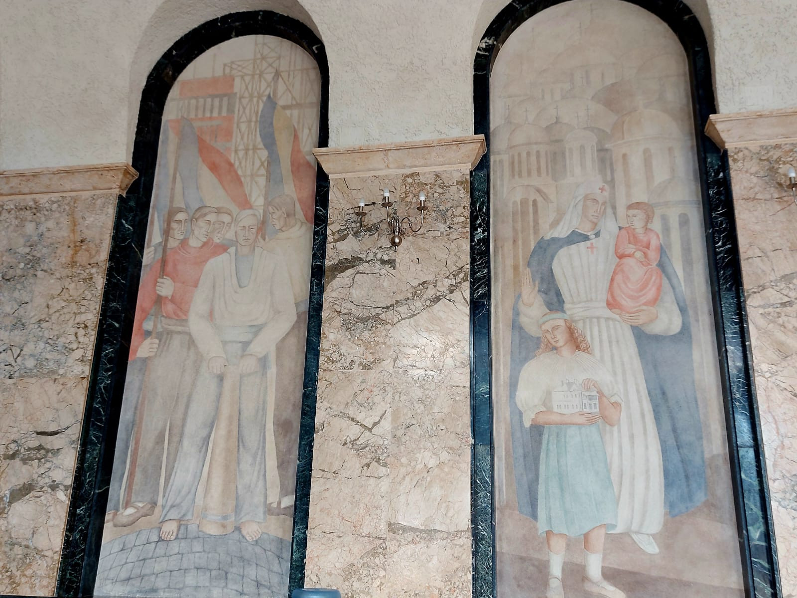 Însă, odată cu venirea la putere a comuniștilor, aceste fresce au fost considerate compromițătoare și s-a cerut distrugerea lor. Conform reprezentanților primăriei, a existat, totuși, o persoană care nu a acceptat ca frescele să dispară pentru totdeauna și care a găsit o soluție prin care să le ascundă. Astfel, frescele au ajuns să fie acoperite cu humă, ba chiar cu mai multe straturi de humă pentru a nu mai exista urma lor.