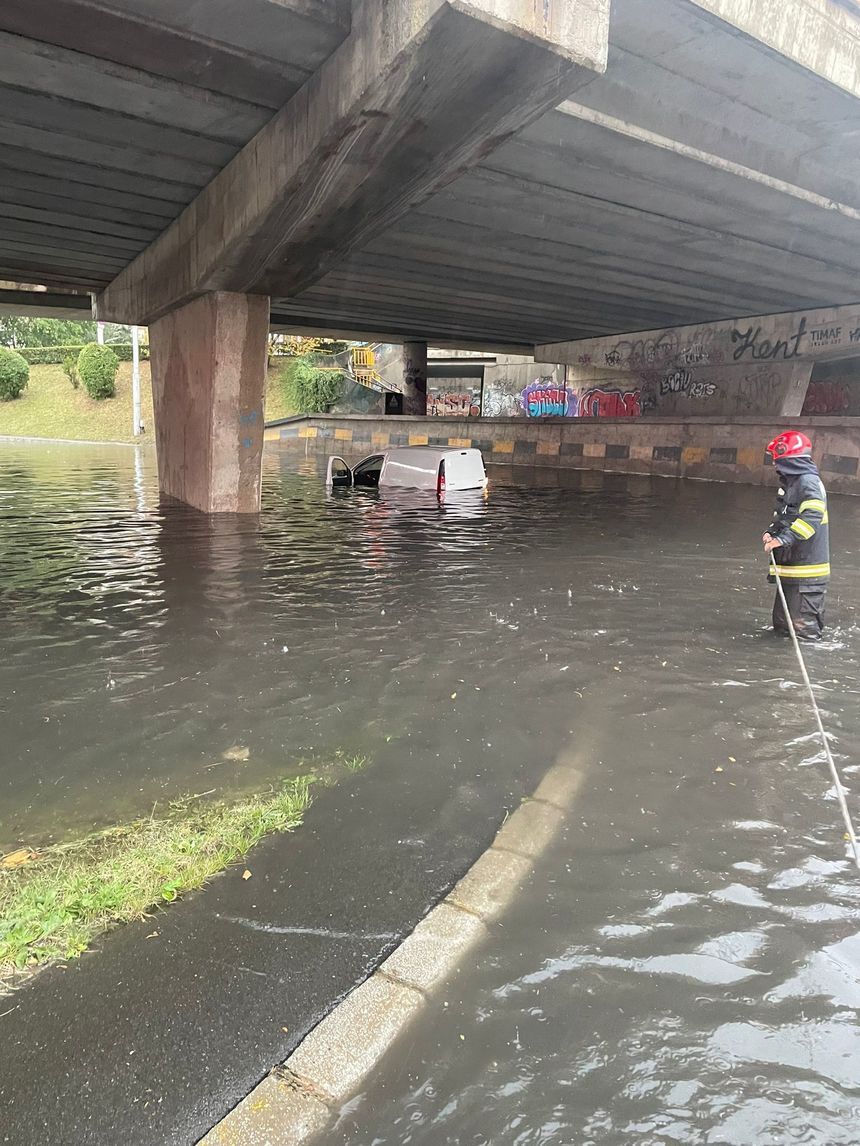 În cartierul Mărăşti, o maşină a rămas blocată sub un pod rutier, din cauza apei adunate. Pompierii au intervenţii în mai multe zone din oraş.