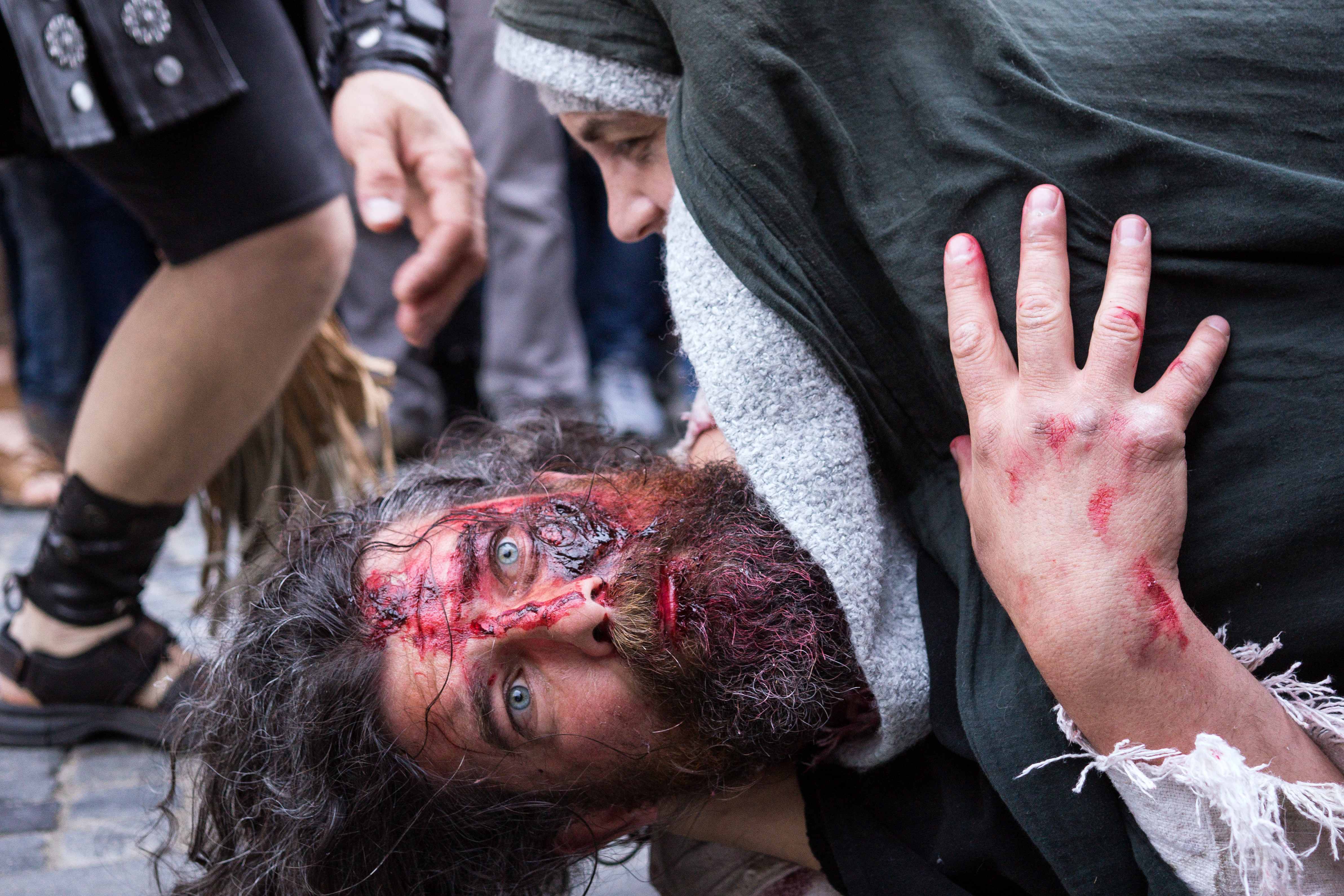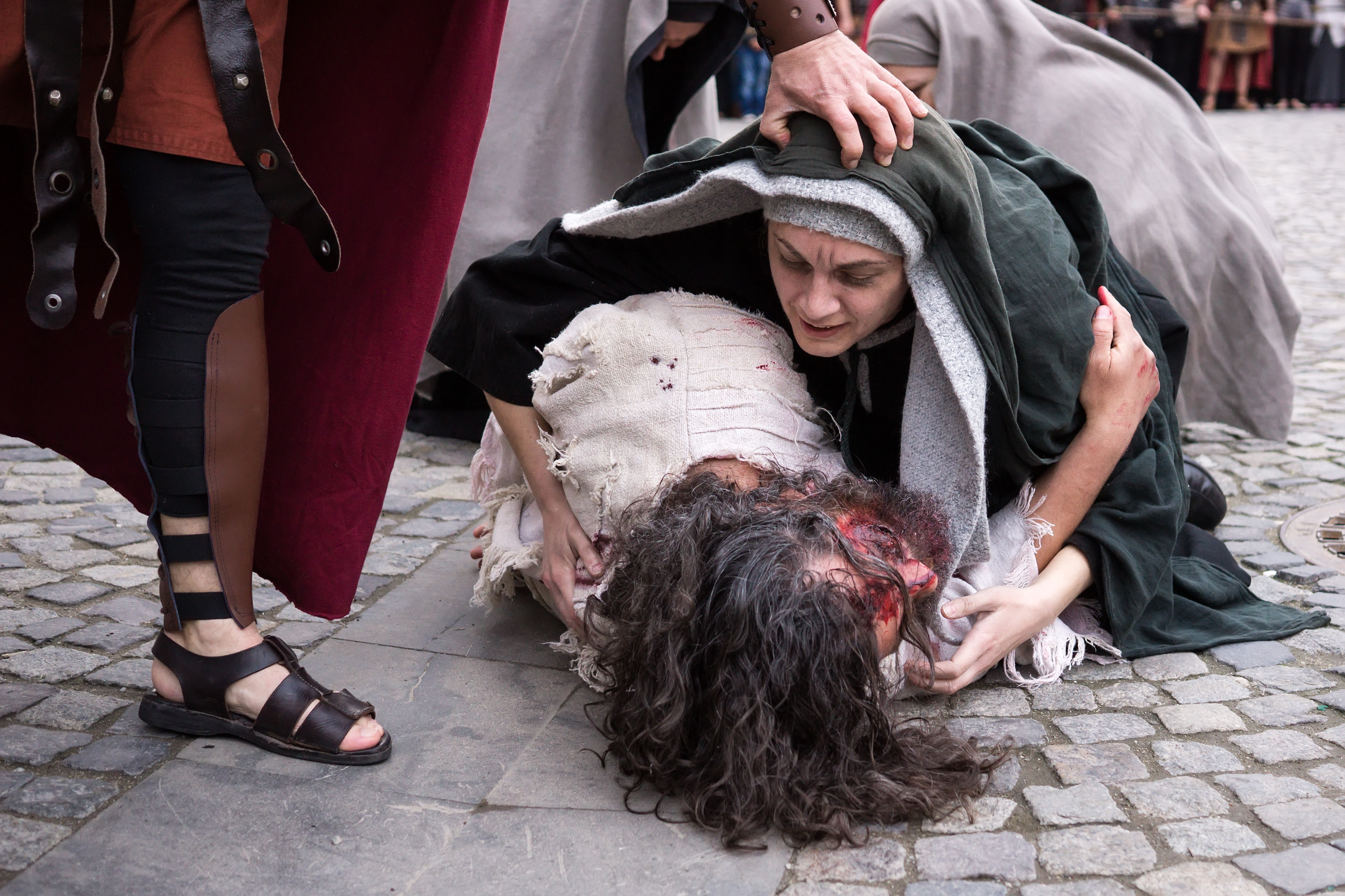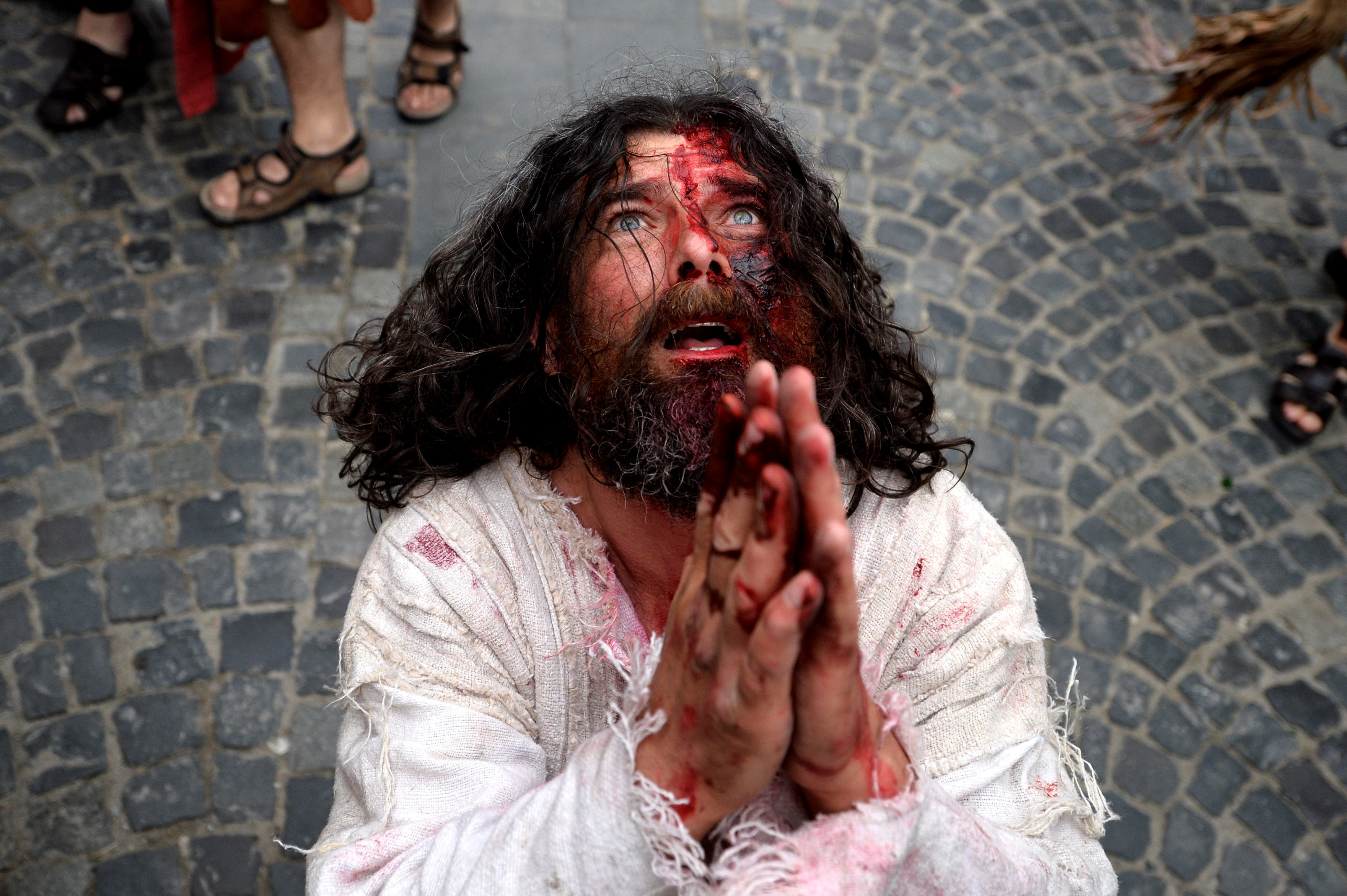 Reprezentatia simbolica "Drumul Crucii" a fost refacuta din nou, marti seara, in Saptamana Patimilor, in centrul Bucurestiului, de artistul Daniel Les, care a interpretat rolul lui Iisus Hristos.