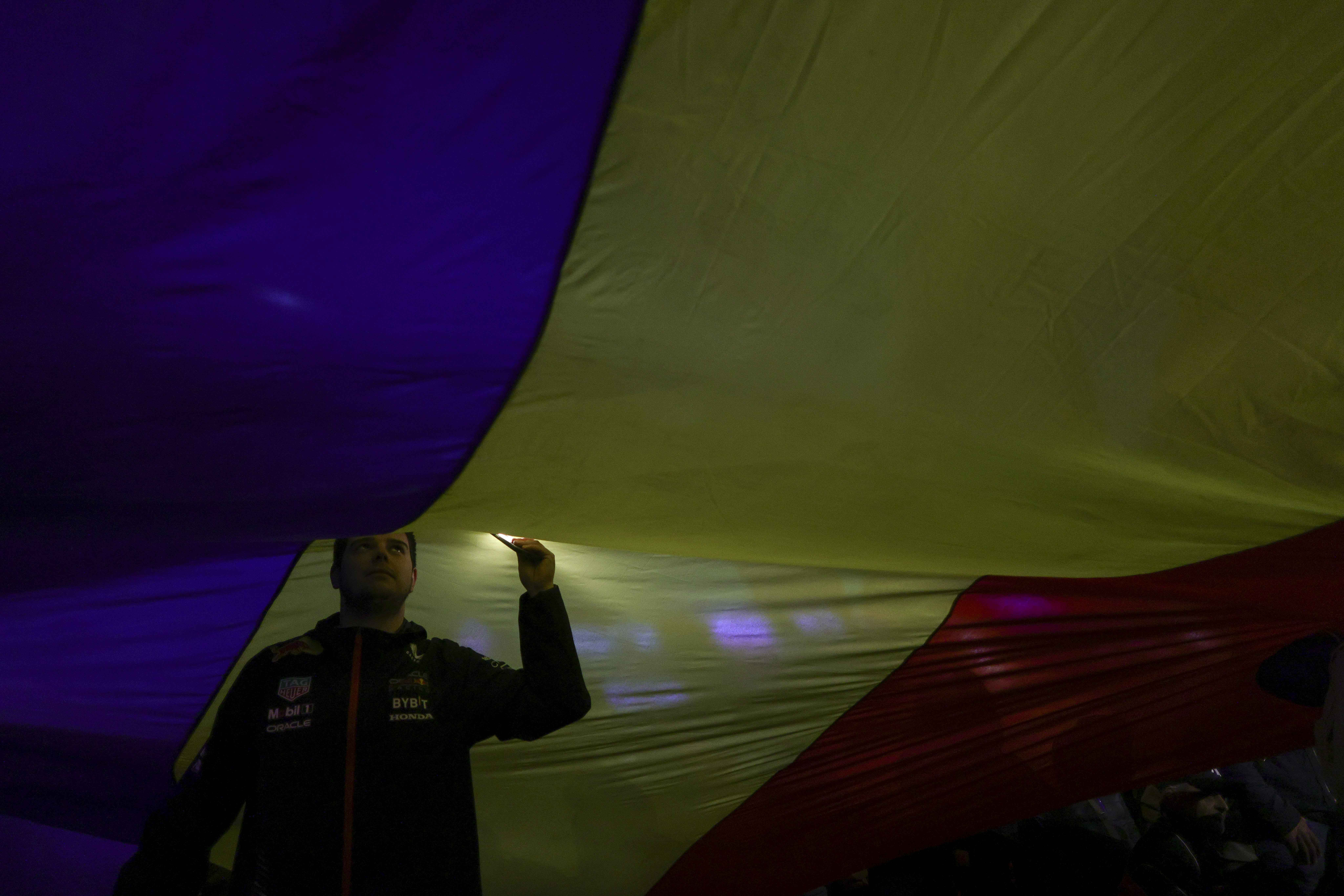 În mijlocul mulțimii au fost întinse doua drapele imense, al României și al Uniunii Europene.