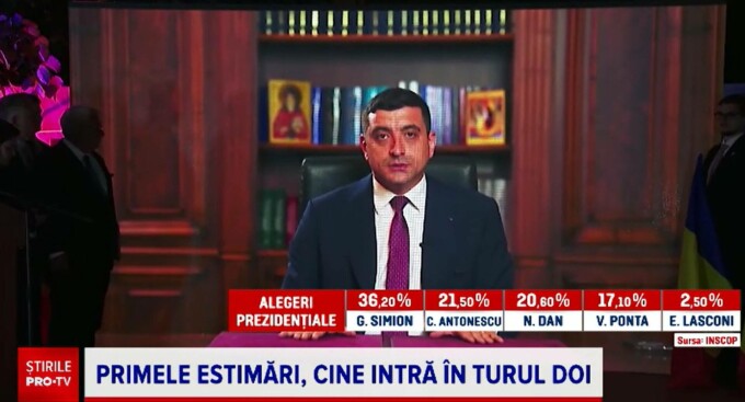 George Simion a intrat în turul 2 al alegerilor prezidențiale cu un procent de 30% din voturile celor aproximativ 9,6 milioane de români care s-au prezentat duminică la urne, potrivit exit-poll-ului Avangarde.