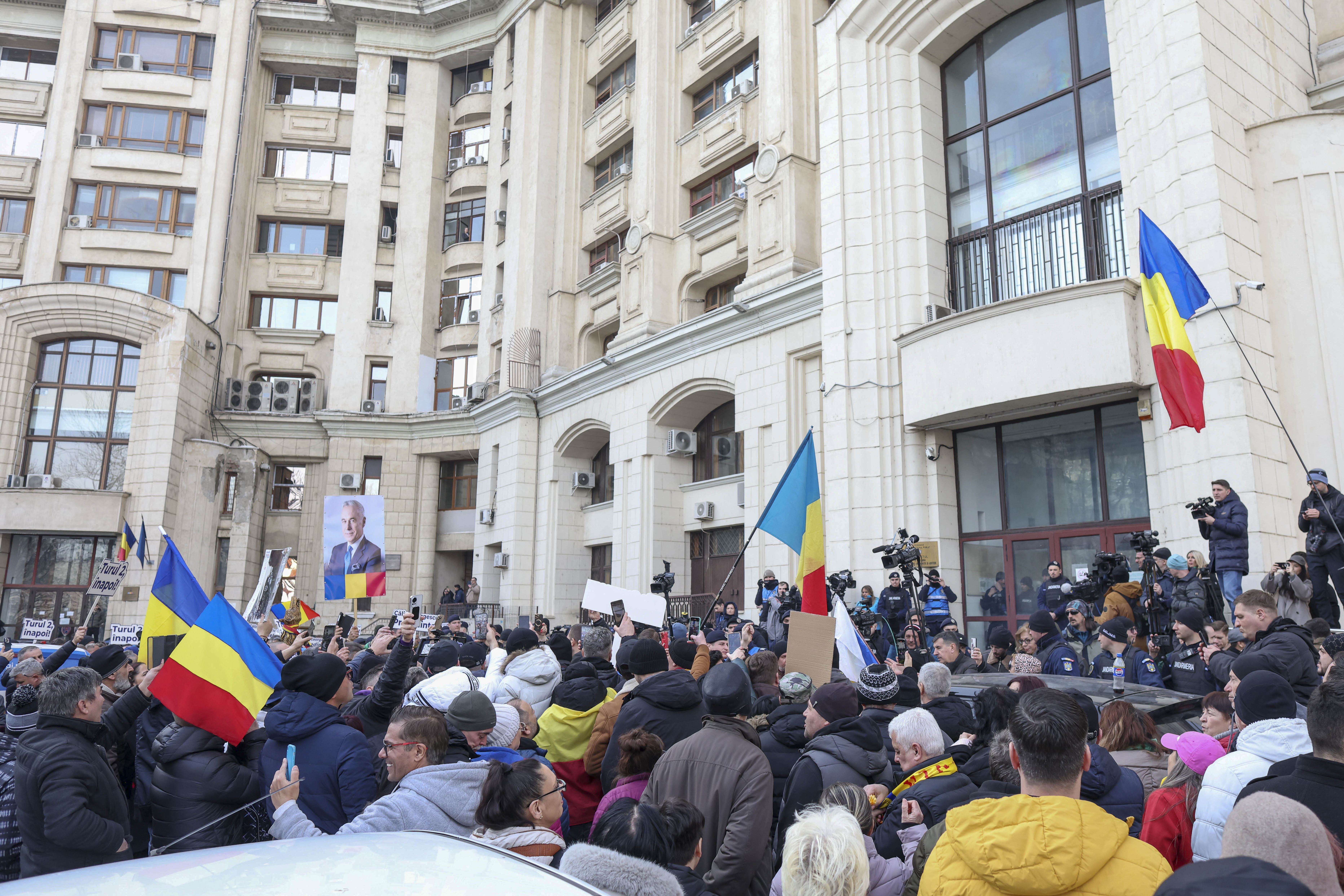 De asemenea, ei afişează pancarte cu mesaje cum ar fi "Opriţi dictatura", "Turul doi, înapoi", "Călin Georgescu preşedinte".