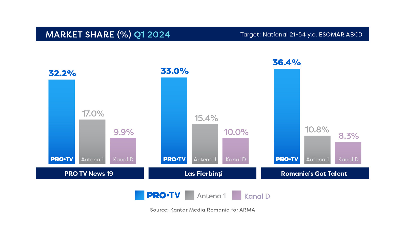 Este pentru prima dată, în ultimii 10 ani, când PRO TV, Acasă, Acasă Gold, PRO Cinema, PRO Arena, împreună, depășesc 29% cotă de piață la nivelul zilei și 33% share în prime-time. PRO TV a fost lider de piață atât pe targetul comercial PRO (public Național, cu vârsta cuprinsă între 21 și 54 de ani, din categoriile ESOMAR ABCD), cât și pe targetul Național.