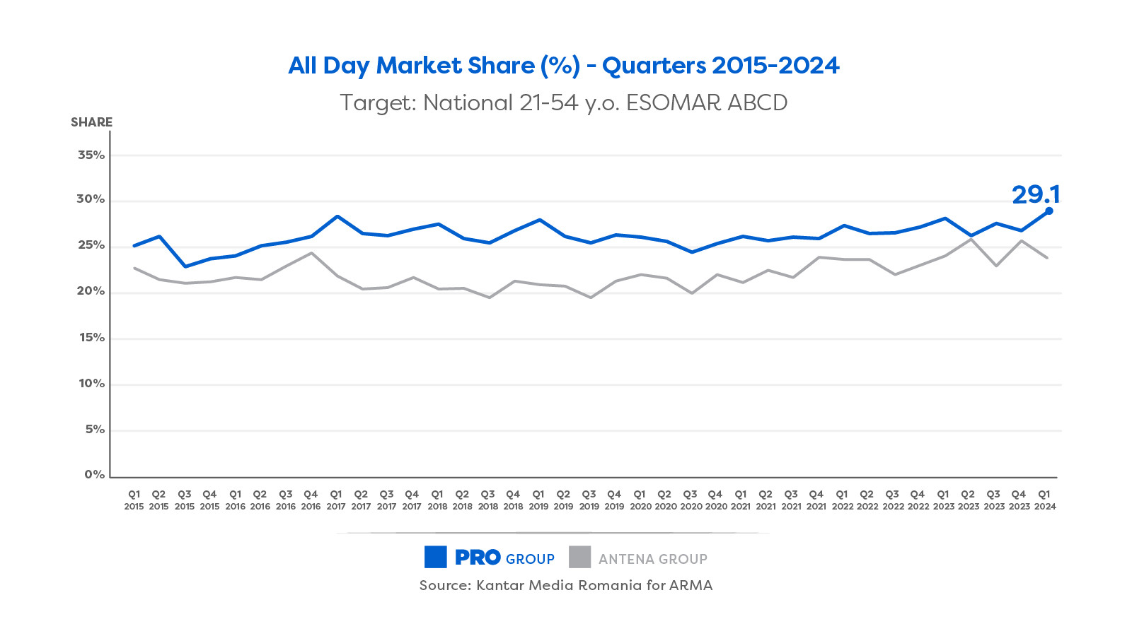 În primul trimestru din 2024, pe segmentul comercial PRO, grupul a înregistrat o cotă de piață de 29.1% pe întreaga zi și de 33.1% în prime-time. Este al treilea trimestru la rând cu o cotă de piață de peste 30% în prime-time, televiziunile PRO având o cotă de piață cu aproape 50% mai mare față de cota de piață a principalului competitor, care a avut 22.8% din piață. La nivelul zilei, cota de piață a grupului a fost cu 5.5 puncte procentuale mai mare decât grupul de pe poziția secundă.