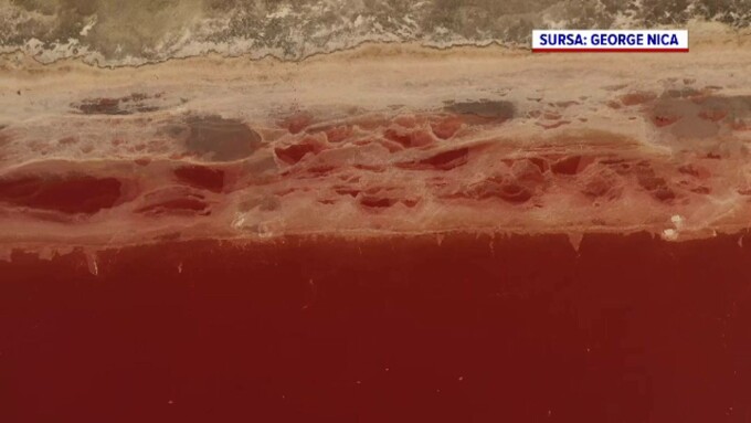 Lacul de la marginea localității a devenit roșu ca într-un peisaj de pe Marte odată cu zilele caniculare din ultimele săptămâni.