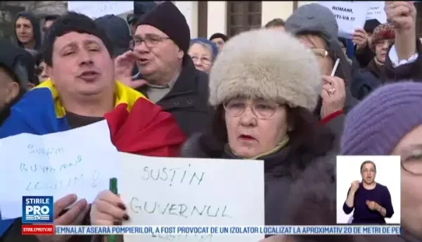 UPDATE 16:00 Ei au afisat hartii pe care scrie: "Sustin Guvernul legitim”, "Jos Iohannis”, "Jos Kovesi” si "Jos labele de pe Guvern”. Unii dintre manifestanti spun ca cei care protesteaza in Piata Victoriei sunt manipulati, iar altii reclama faptul ca ei trebuie sa stea pe un trotuar, in timp ce la protestul din fata sediului Guvernului este spatiu larg de desfasurare.