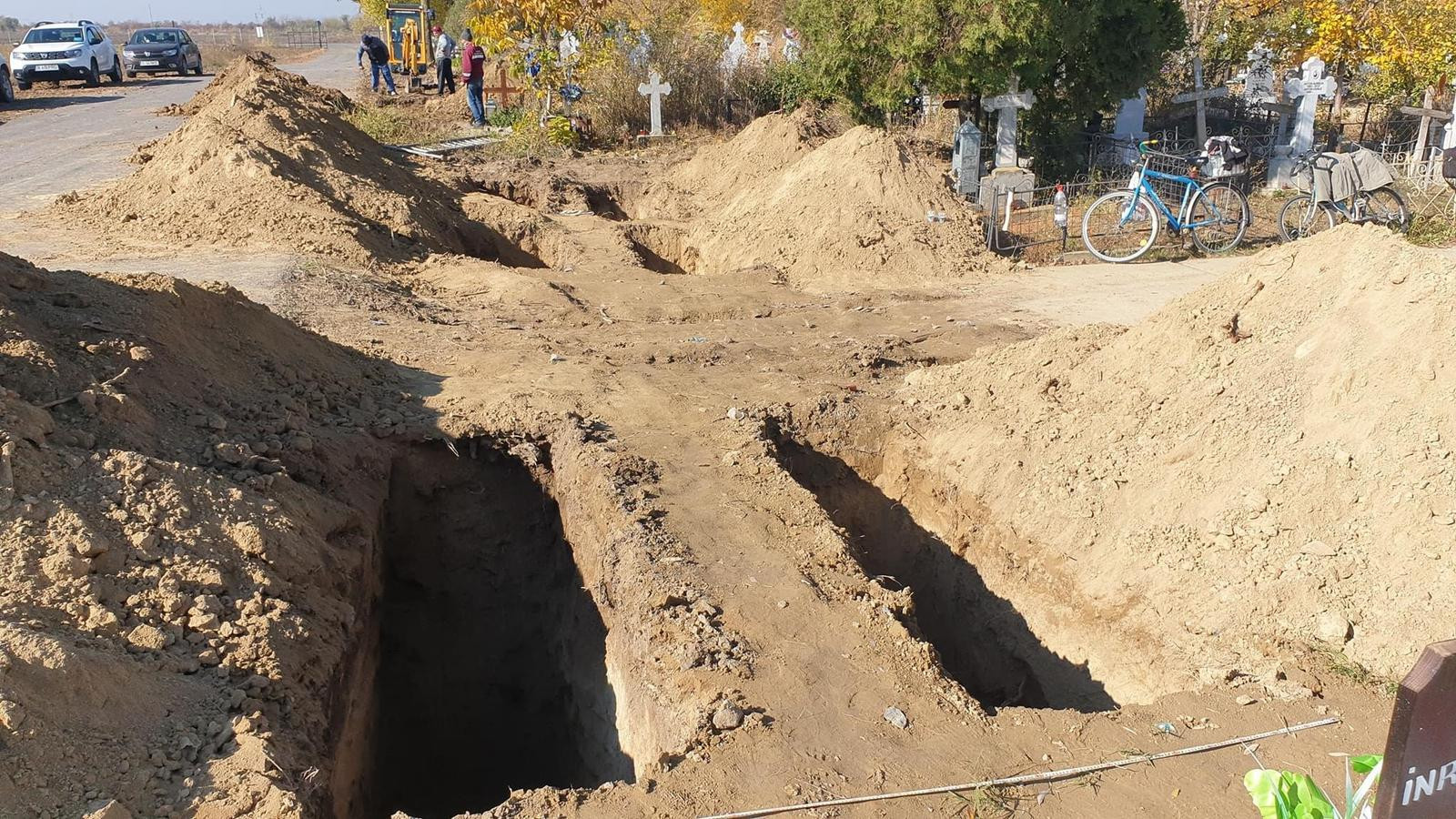 Din cauza numărului mare de decese cauzate de COVID, miercuri au avut loc opt înmormântări în cimitirul orașului Slobozia, iar astăzi alte șapte. Groparii sunt depășiți de situație, iar din această cauză a fost adus în ajutor un mini excavator. De asemenea, groparii sunt ajutați și de angajați de la Administrația Drumurilor. Se fac trei înmormântări în două ore.
