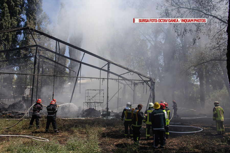 Daniel Vasile, ISU: "La sosirea primelor 4 autospeciale incendiul se manifesta la vegetatie si apoi s-a extins la peretii cortului, cu propagare atat pe orizontala cat si pe verticala, arderea a fost violenta, materialele din interior au ars cu flacara."