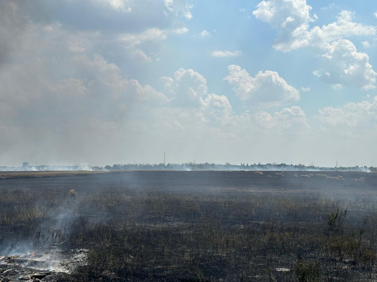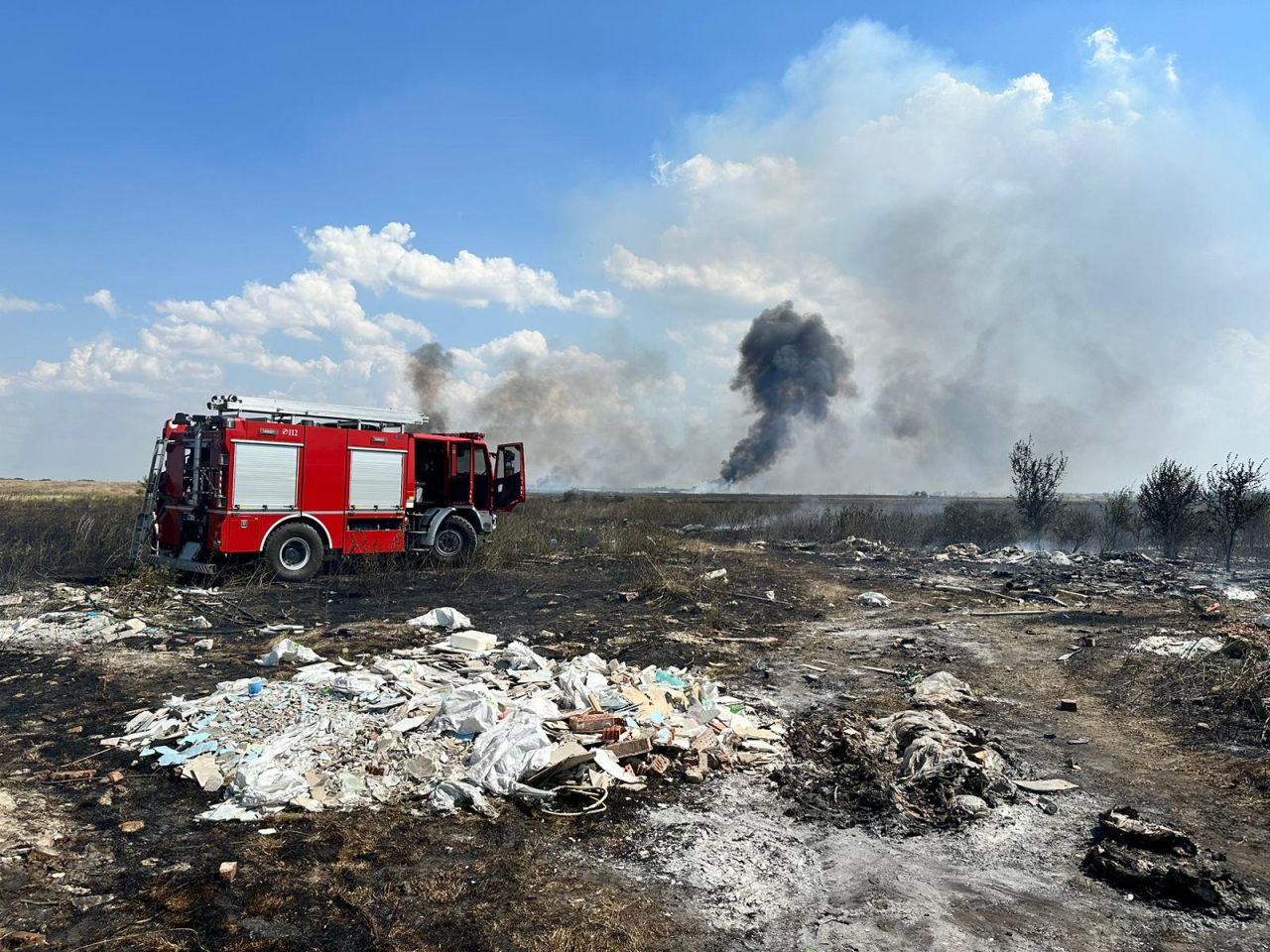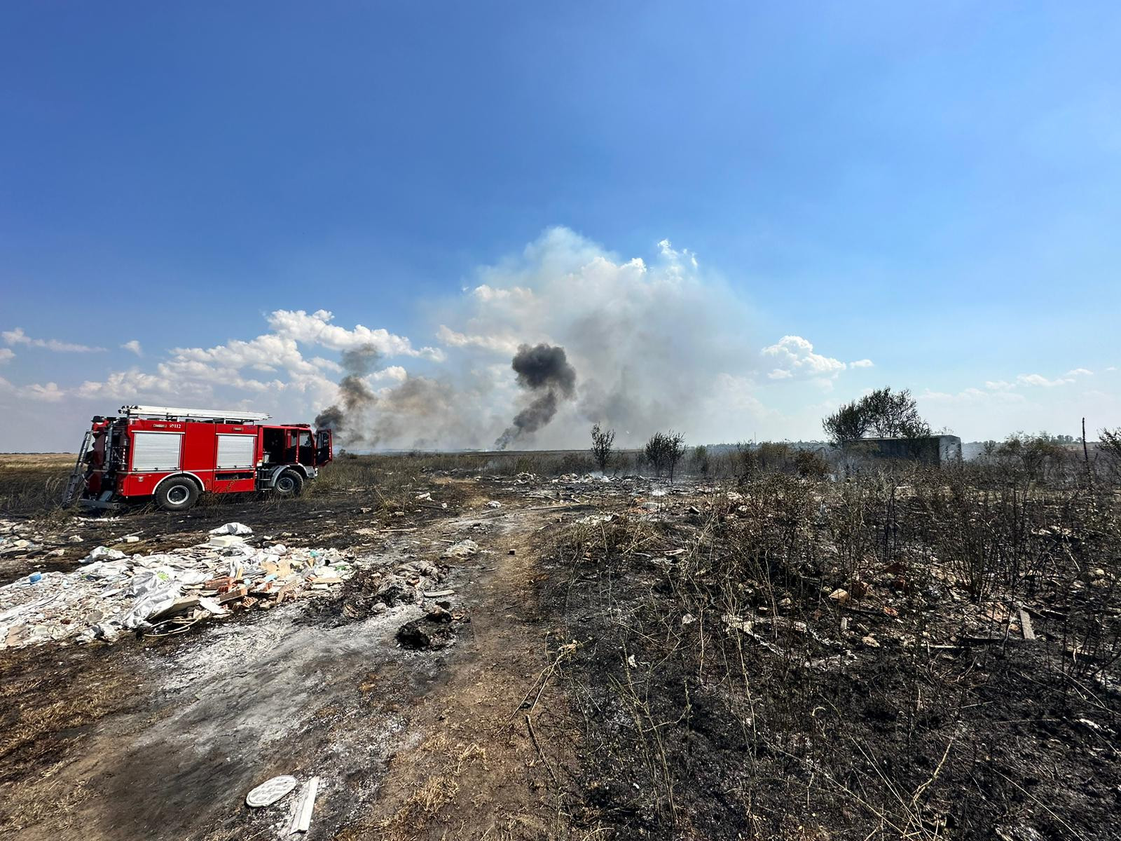 Incendiul se manifestă pe un câmp, fiind degajări mari de fum pe o suprafață de aproximativ 10 hectare.