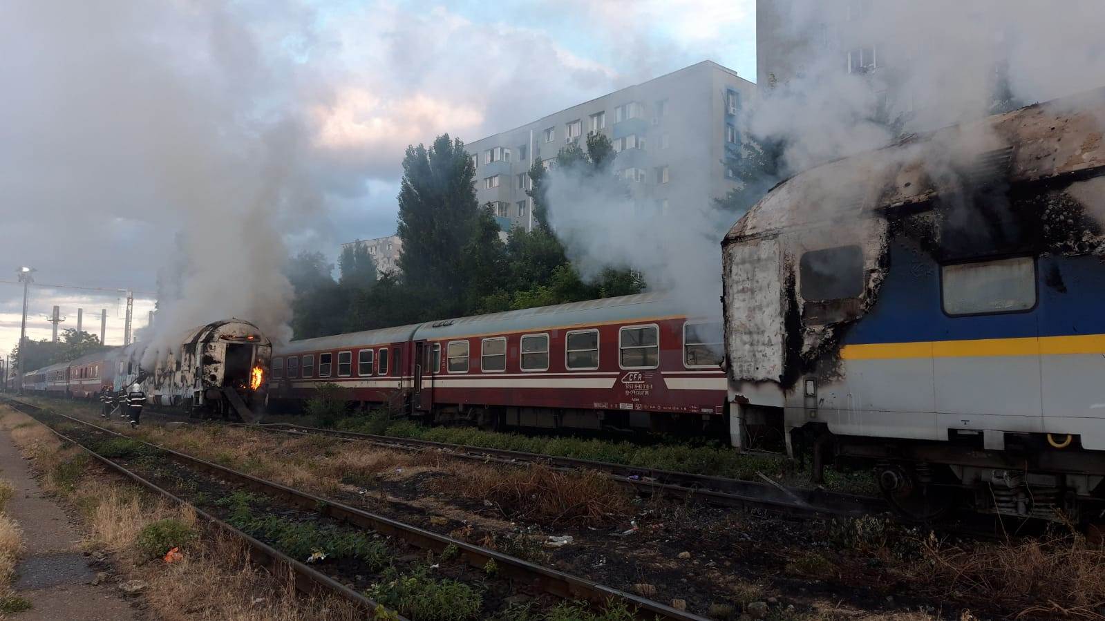 Incendiu puternic. Două vagoane de tren, cuprinse de flăcări