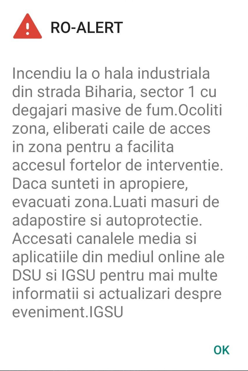 Întrucât incendiul se manifestă cu degajări mari de fum, a fost transmis mesaj prin Ro Alert pentru protecția populației. "Incendiu la o hală industrială din strada Biharia, sector 1, cu degajări masive de fum. Ocoliţi zona, eliberaţi căile de acces în zonă pentru a facilita accesul forţelor de intervenţie. Dacă sunteţi în apropiere, evacuaţi zona. Luaţi măsuri de adăpostire şi autoprotecţie".