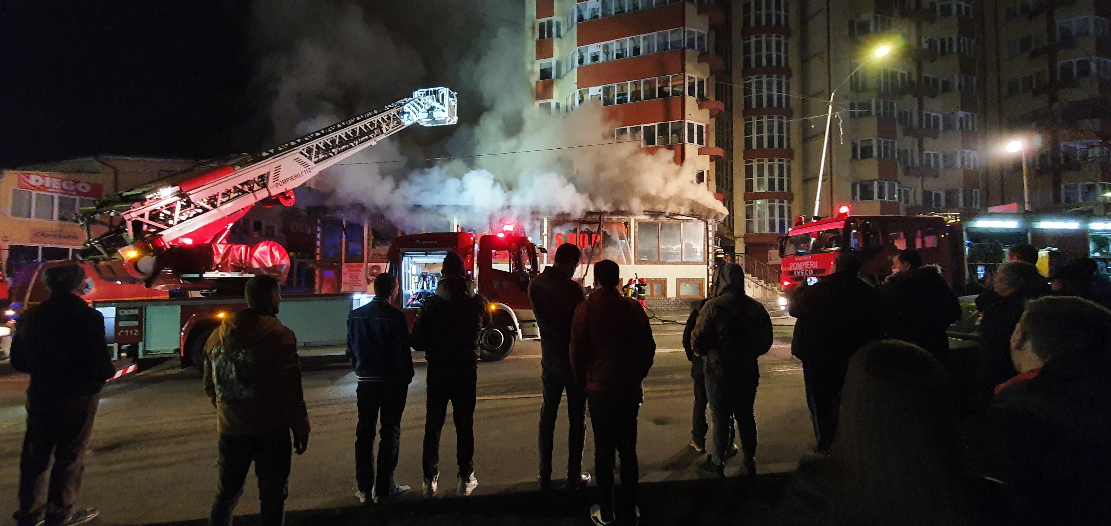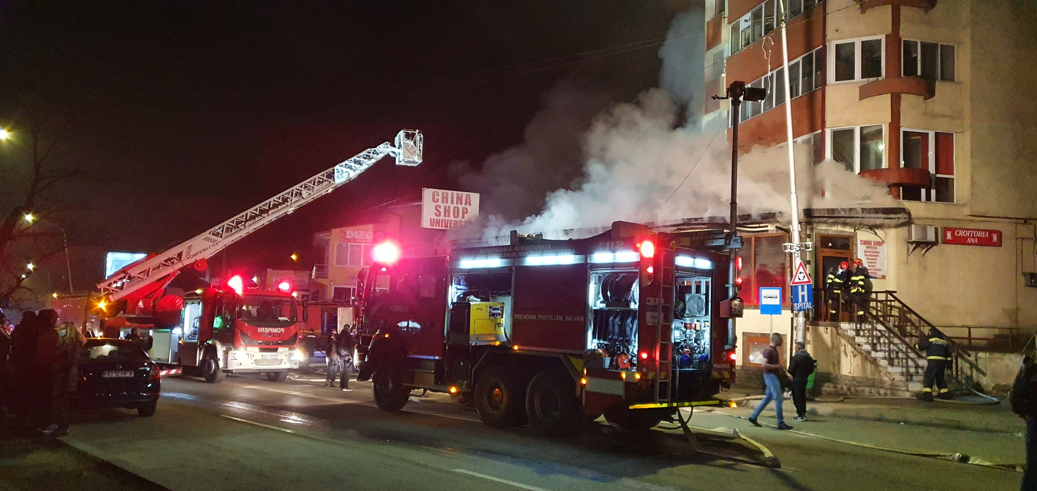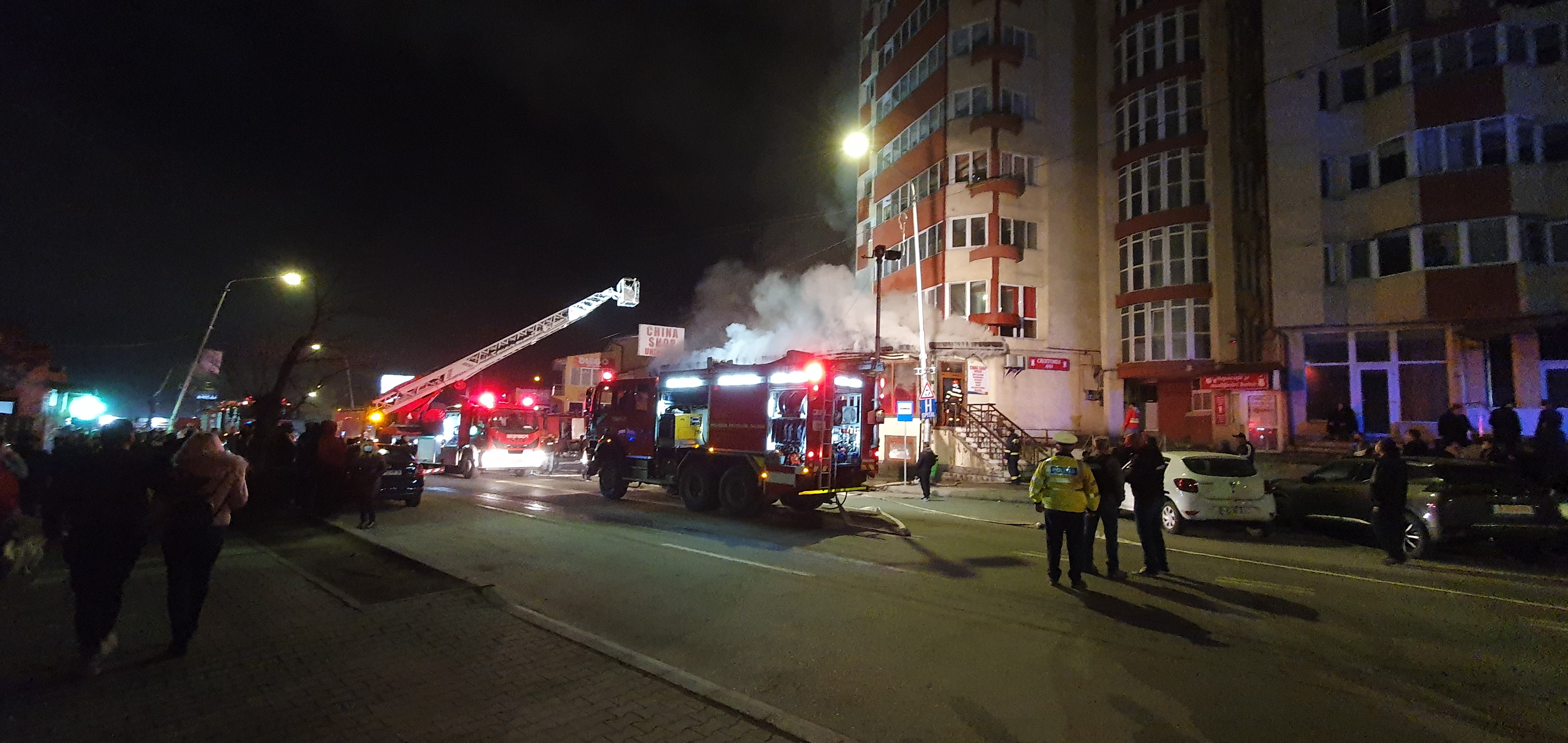 UPDATE - Pompierii au evacuat din blocul aflat în imediata apropiere a spaţiului comercial incendiat 10 persoane. Alţi 30 de locatari s-au autoevacuat. Acoperişul afectat de incendiu are aproximativ 150 mp.