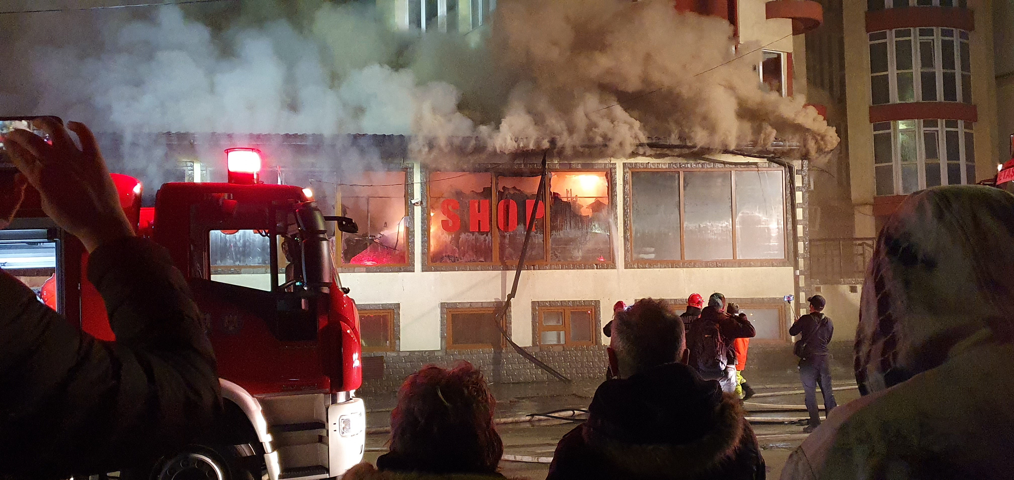 Incendiu puternic în Petroșani. Un magazin aflat lângă un bloc de locuințe a luat foc. VIDEO