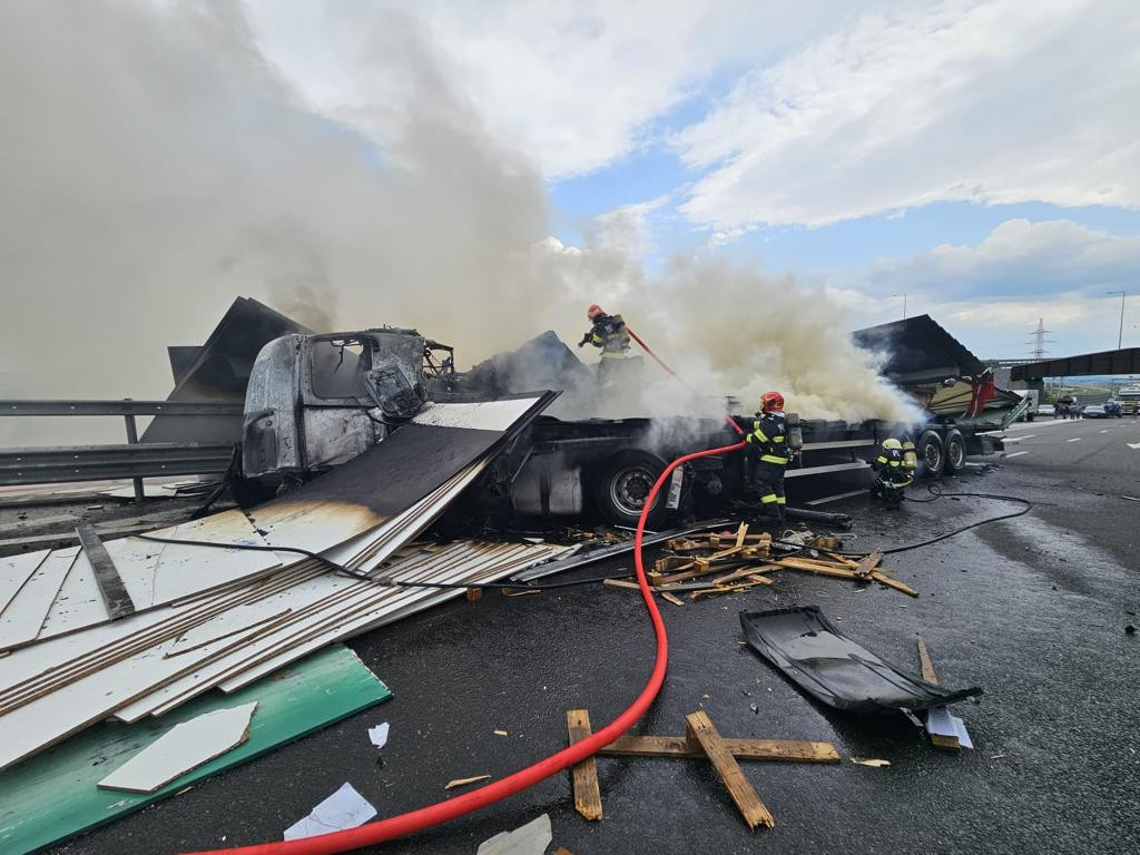 Inspectoratul pentru Situaţii de Urgenţă Alba a informat că Detaşamentul de Pompieri Alba Iulia intervine pentru localizarea şi stingerea unui incendiu izbucnit la un autocamion pe autostrada A10.