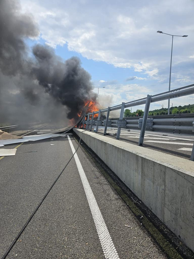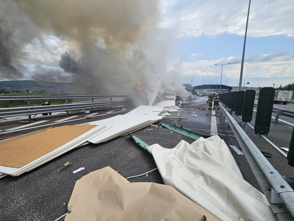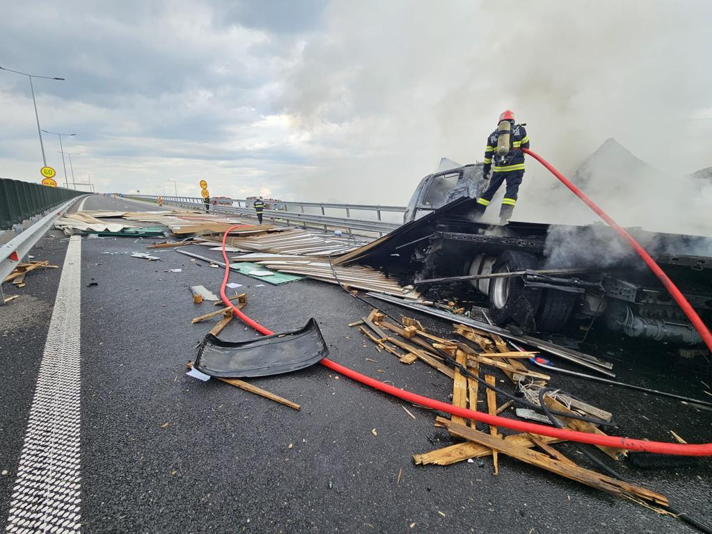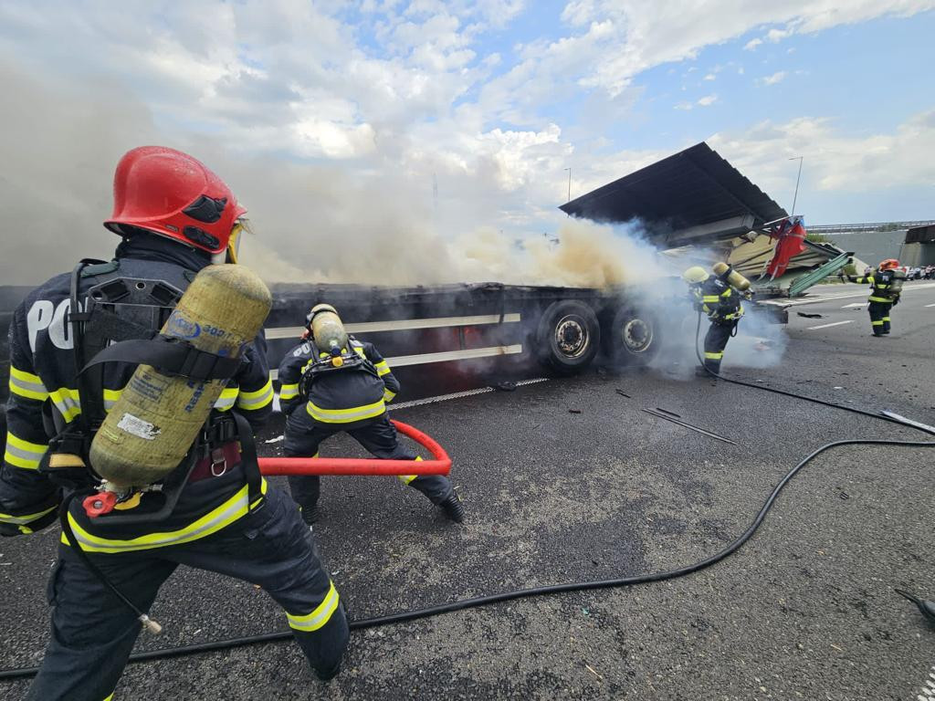 Incendiu puternic pe A10, după ce un camion a explodat în mers şi s-a oprit într-un parapet | FOTO