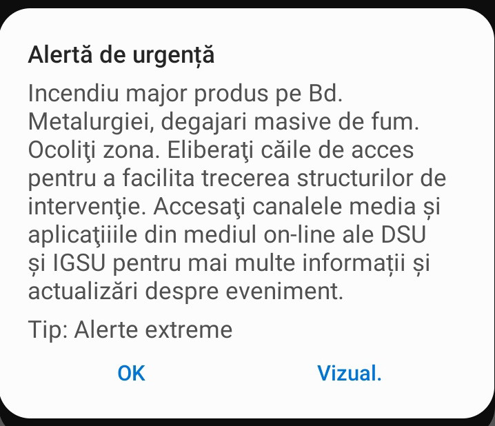 Autorităţile au emis şi un mesaj RO-Alert în care anunţau populaţia să evite această zonă pentru că aici au loc degajări masive de fum în urma unui incendiu. Le-au spus oamenilor de altfel să elibereze toate căile de acces pentru a le putea permite autospecialelor de stingere să intre în această curte.