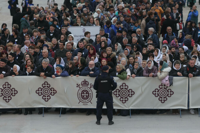„În jurul orei 05:30, la solicitarea personalului administrativ al Catedralei, a fost dispusă restricţionarea temporară a accesului prin uşa principală, pentru efectuarea operaţiunilor de curăţenie. Ca urmare, dispozitivul de ordine a fost reconfigurat, iar accesul enoriaşilor a fost redirecţionat prin intrarea laterală. În momentul închiderii temporare a uşilor principale, un număr redus de persoane a interpretat eronat măsura şi a încercat să înainteze către scările Catedralei, crezând că accesul va fi blocat total. Jandarmii au acţionat cu promptitudine, prin temporizarea fluxului de persoane şi restricţionarea temporară a accesului în curtea Catedralei. Simultan, enoriaşii au fost îndrumaţi să se retragă pe platoul central”, informează Jandarmeria Bucureşti.