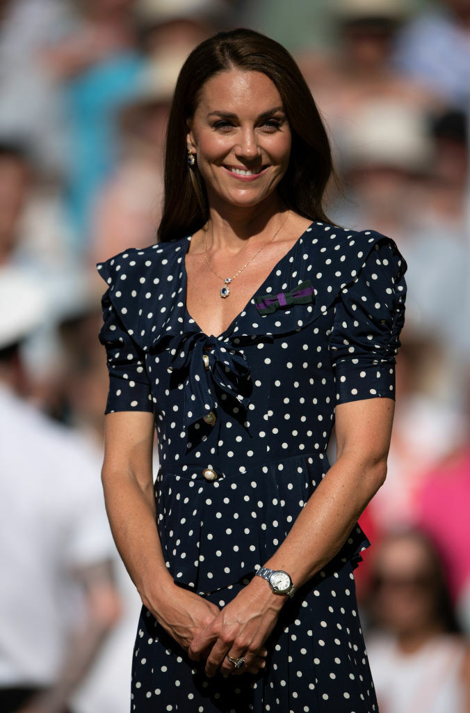 Pe 5 iulie, Kate a mers la turneul de tenis de la Wimbledon împreună cu soțul ei, prințul William. Pentru eveniment, Kate a ales să poarte o rochie albastră, plisată de la designerul Alessandra Rich. În completarea ținutei, Kate a ales o pereche de cercei cu perlă roz, ochelari de soare de culoare neagră, o geantă albă și o pereche de pantofi albi cu toc.