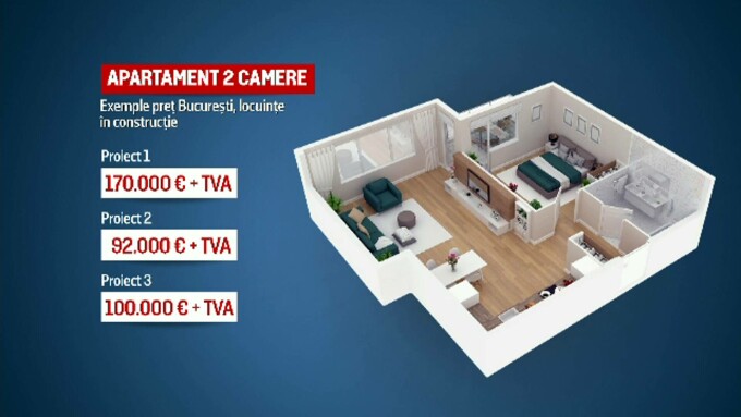 Prețurile diferă și în funcție de zonă, suprafață și de utilități. Am vizitat trei proiecte diferite în București și am întrebat cât costă un apartament de două camere. Prețurile variază între 100 de mii și 170 de mii de euro.