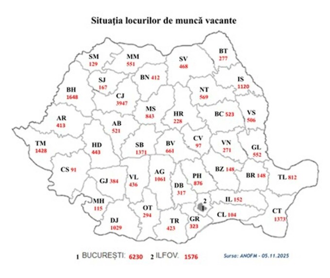 Potrivit datelor furnizate de agenţii economici privind locurile de muncă vacante, în evidenţele Agenţiei Naţionale pentru Ocuparea Forţei de Muncă (ANOFM), cele mai multe locuri de muncă sunt oferite, la nivel naţional, pentru: curier (2.287); conducător auto transport rutier (2.199); muncitor necalificat la demolarea clădirilor, căptuşeli zidărie, plăci mozaic, faianţă, gresie, parchet (1.806); agent de securitate (1.433); manipulant mărfuri (1.202); muncitor necalificat la asamblarea şi montarea pieselor (1.070); ajutor bucătar (981); muncitor necalificat la spargerea şi tăierea materialelor de construcţii (941); lucrător comercial (918); agent curăţenie clădiri şi mijloace de transport (663); operator fabricaţie flux (617) etc.