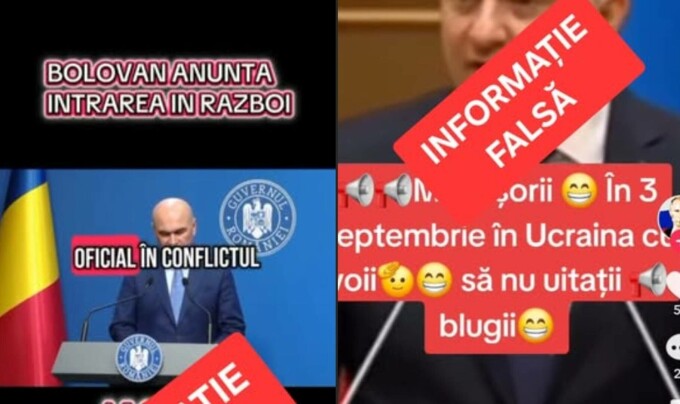Semnalăm existenţa unei campanii de răspândire a unor informaţii false, prin care sunt prezentate ca fiind veritabile clipuri false, realizate cu ajutorul programelor de inteligenţă artificială, din care reiese că prim-ministrul Ilie Bolojan anunţă intrarea României în război, începând cu luna septembrie 2025”, a transmis, marţi, Ministerul de Interne.