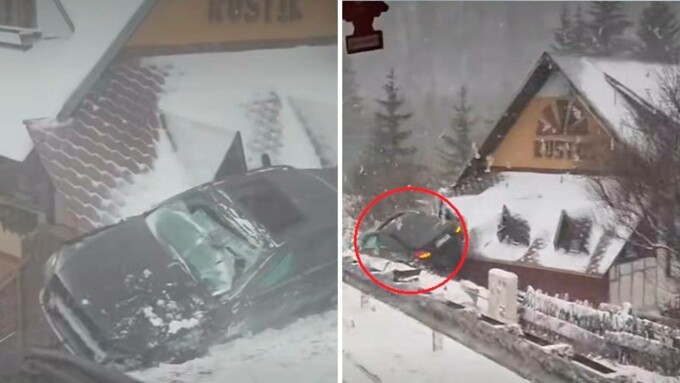 Un șofer a pierdut controlul mașinii, a derapat şi a rămas blocat pe acoperişul unei pensiuni din Predeal.