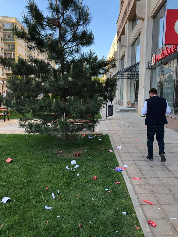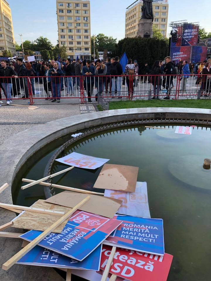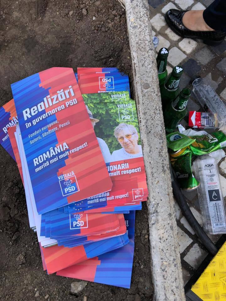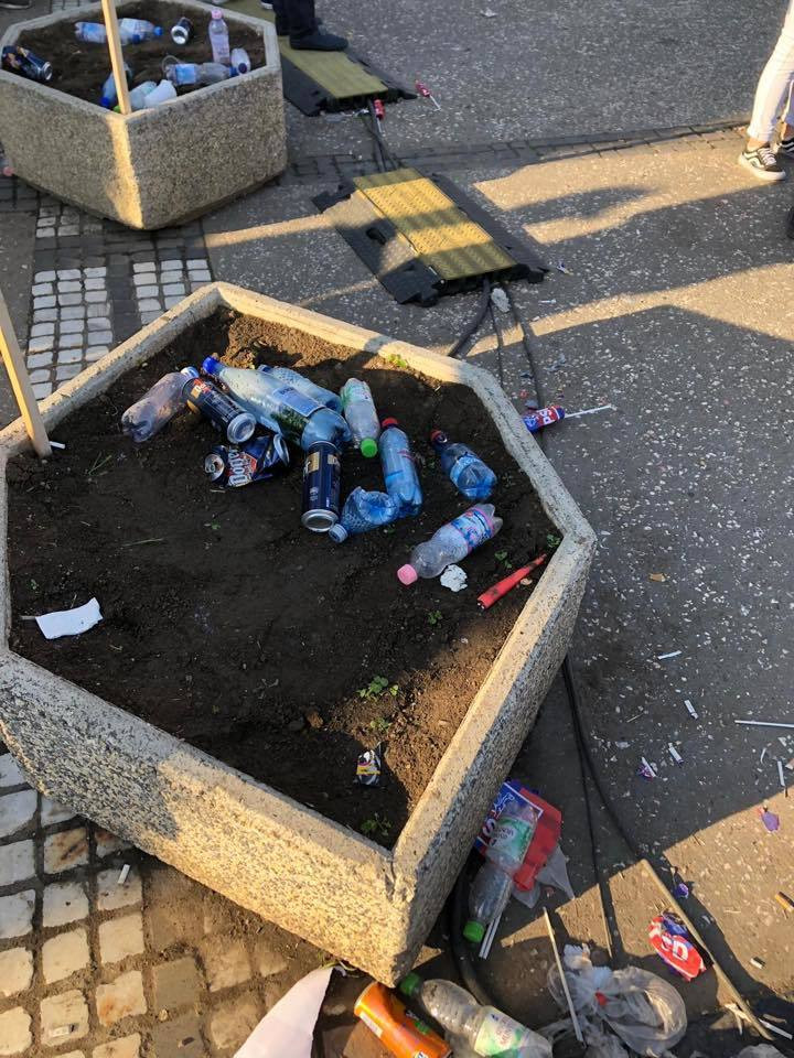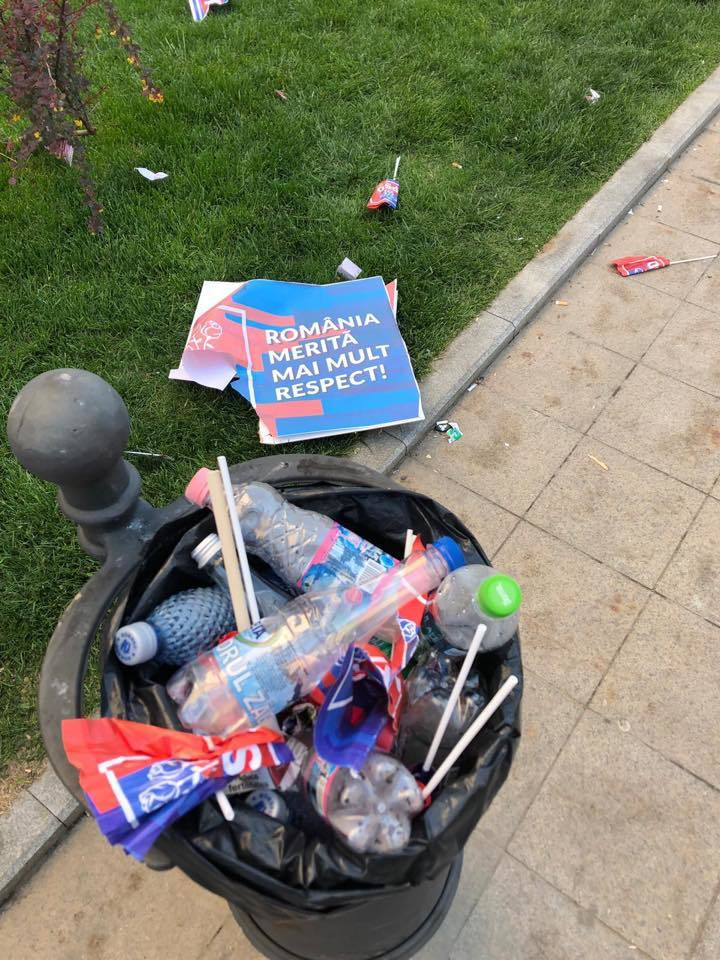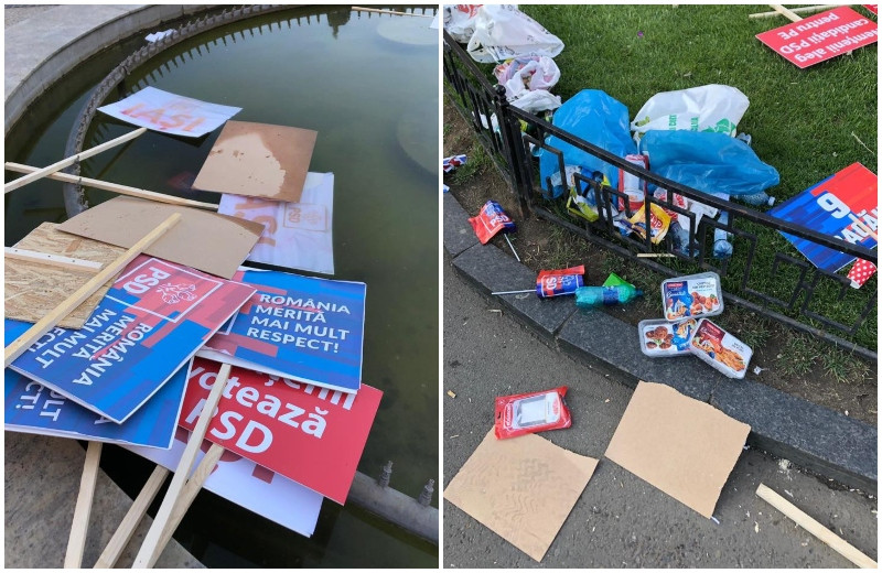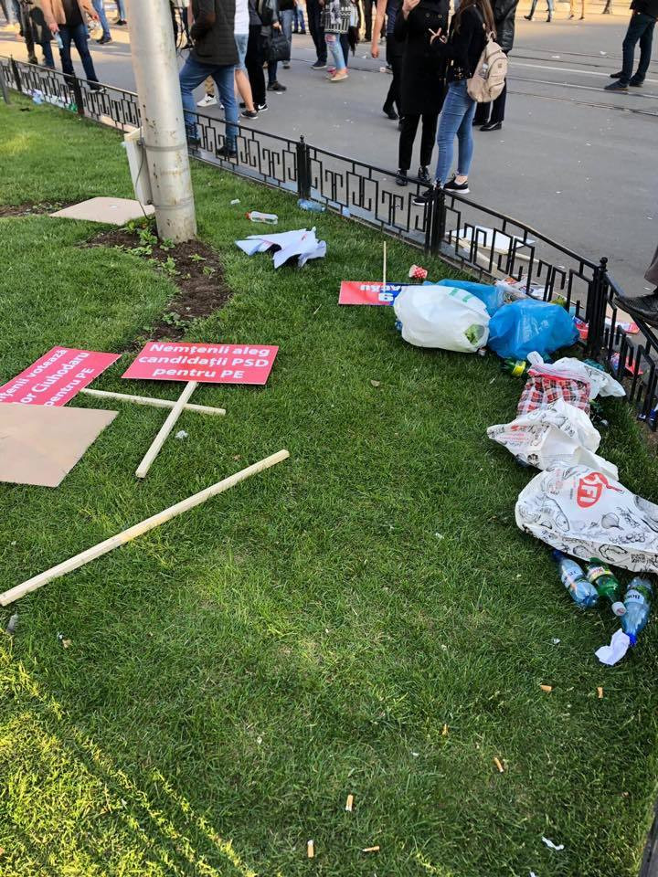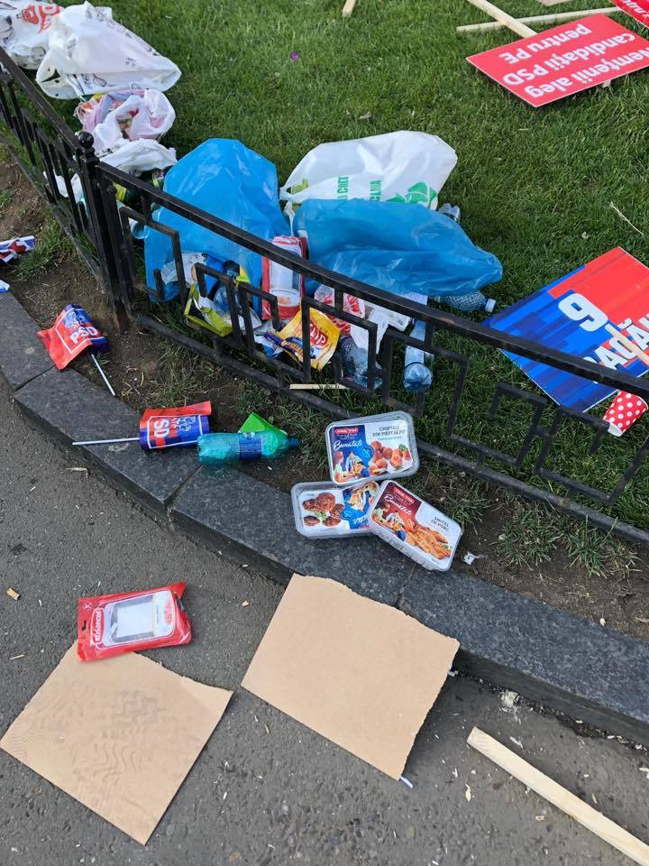 Fotografiile ilustrează mizeria lăsată în urmă de participanții la mitingul PSD, organizat cu ocazia Zilei Europei.