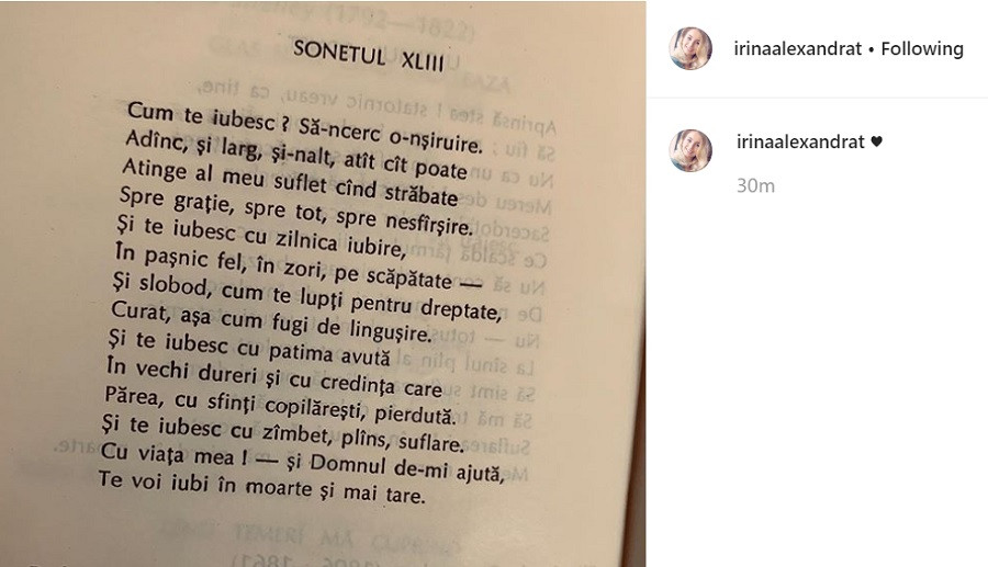 Iubita lui, Irina Tănase, a postat pe contul ei de Instagram o poezie de dragoste scrisă de britanica Elizabeth Barrett Browning.