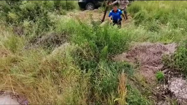 Oamenii au băgat în groapă un trunchi de brad, pentru ca animalul să se poată căţăra pe el.